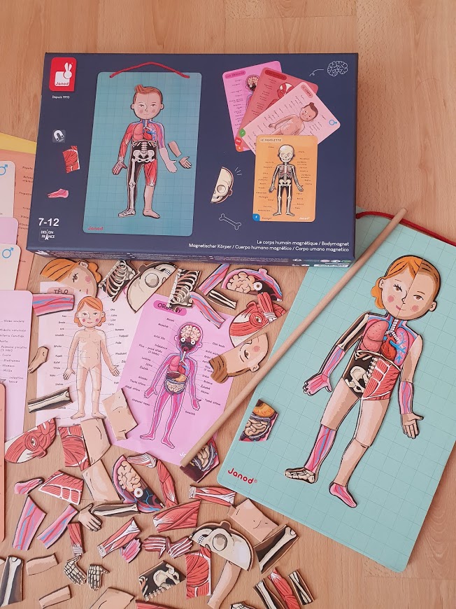 Magnetická hračka je vyrobená zo zdravotne bezpečných materiálov a farieb. Hra je ideálna na učenie sa o ľudskom tele, rozširovanie slovnej zásoby v cudzích jazykoch, dá sa zavesiť na stenu a je to taktiež skvelá pedagogická pomôcka do školy v pestrých farbách, ktoré deti zaujmú.