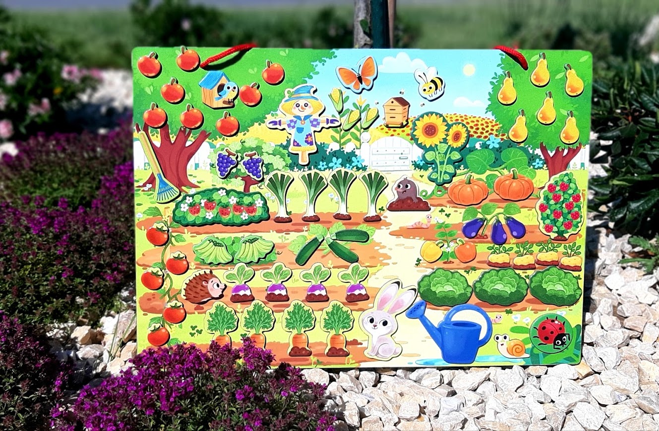Magnetická hračka Moja záhrada je tabuľa na zavesenie, na ktorú si detičky môžu pripevňovať krásne magnetky zo záhrady a to až 70 ks.