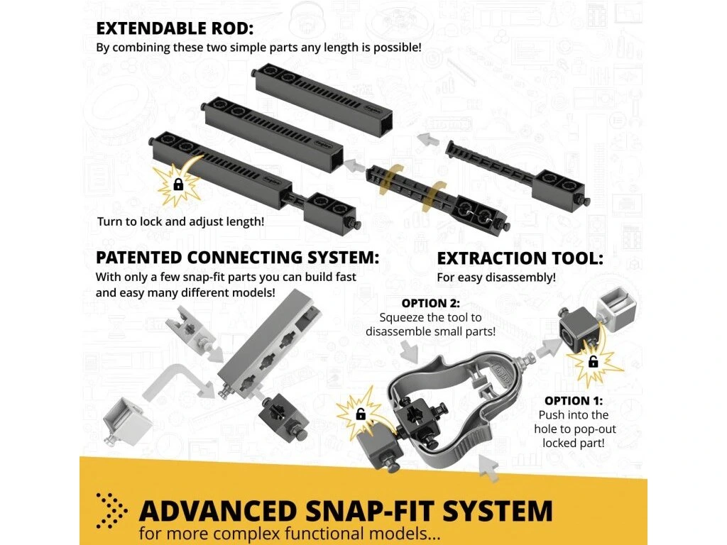 Postavte si 14 funkčných modelov, ako je odpaľovacia plošina, dvere s kľučkou, studňa, letiskové schodisko, experimentálna rampa a štiepací klin.