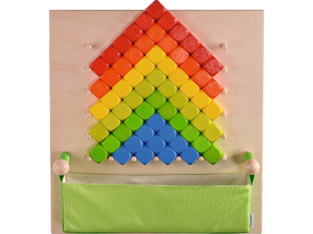 Kocky v 6 farbách sa dajú stohovať medzi drevené kolíky a vytvárať tak skvelé vzory a konštrukcie. Súčasťou je 72 kociek (3 × 3 × 3 cm) a zberný sáčok. Vhodné k senzorickým stenám.