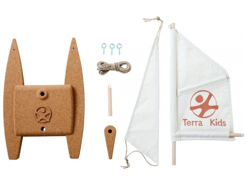 Obsah: 1 korkový trup, 1 kormidlo, 3 drevené sťažne s kruhovými očkami, 2 plachty, 1 sisalová šnúra (5 m dlhá), 3 skrutky s okom, 1 návod.