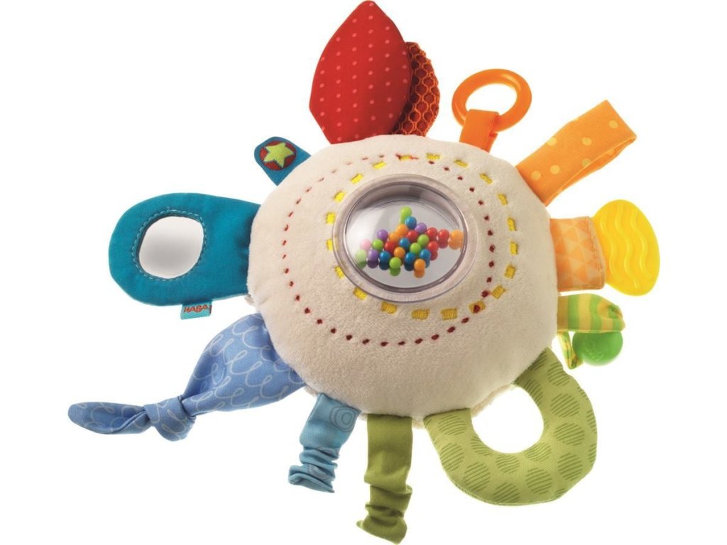 Haba Textilná hrkálka a motorická hračka pre najmenších Dúhový vankúšik