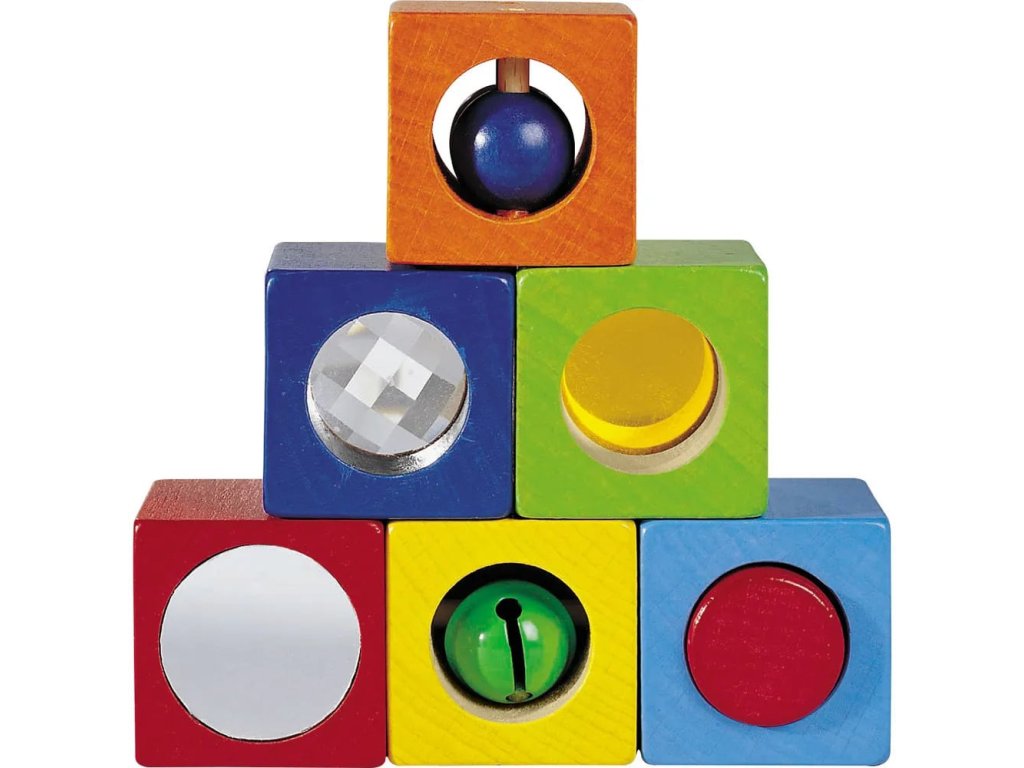 Súprava senzorických drevených kociek pre deti od 12 mesiacov. Kocky sú rôznych farieb a každá z nich ponúka vlastnú aktivitu s vizuálnym alebo zvukovým efektom – rolničku, korálku, zrkadielko či kaleidoskop. Deti sa zabavia objavovaním rôznych prekvapení a zároveň si hrou rozvíjajú jemnú motoriku a precvičujú základné zmyslové vnímanie – zrak, sluch a hmat.