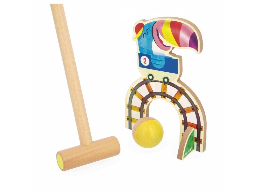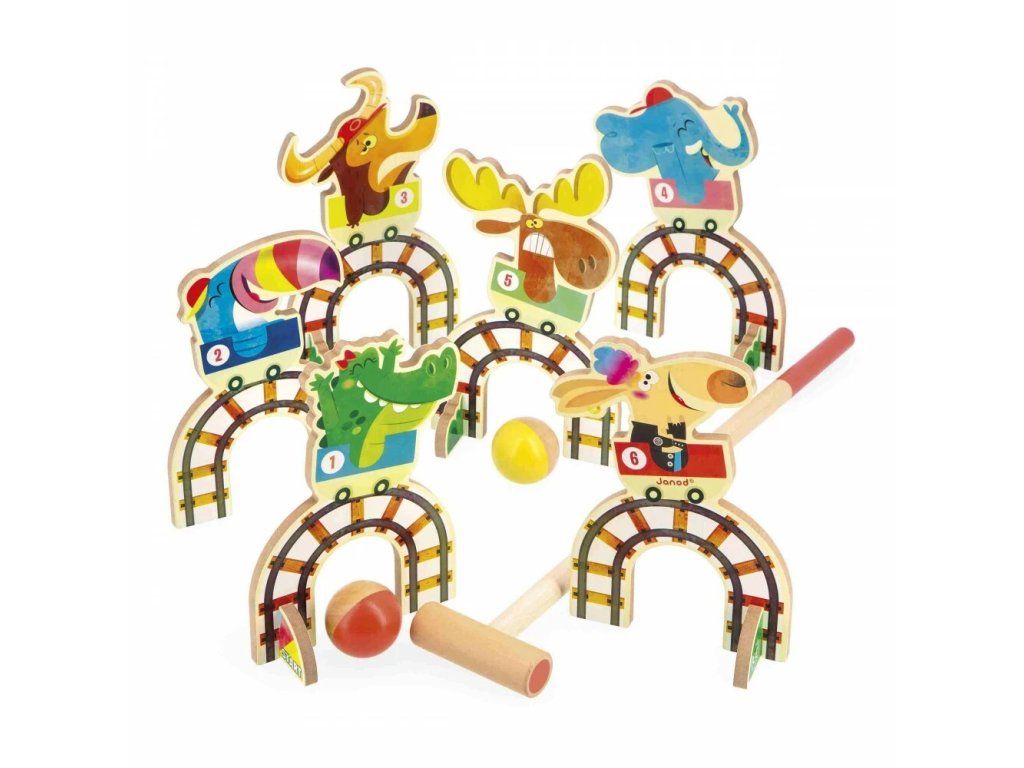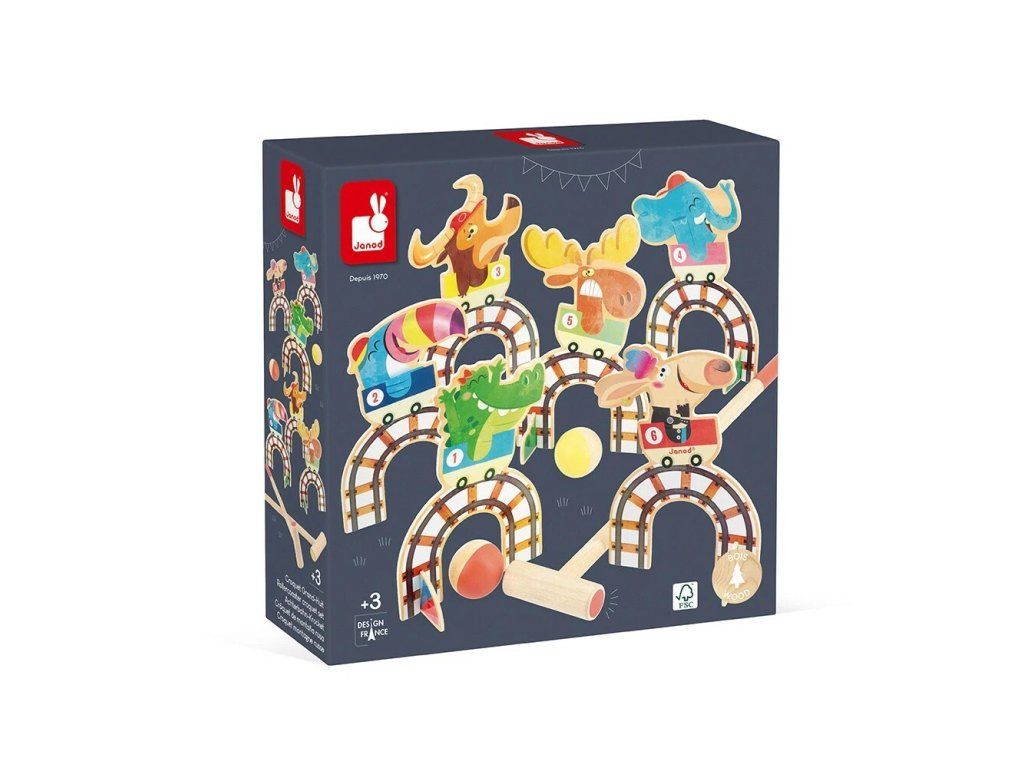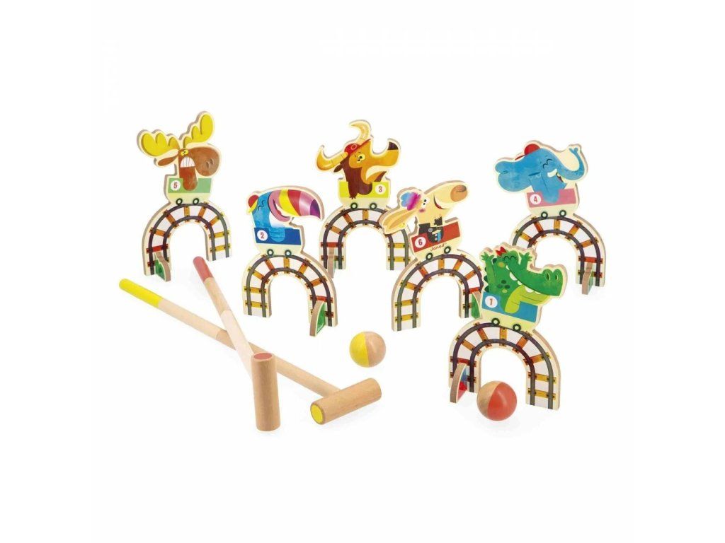 Zdvihnite ruky, atrakcia sa práve začína! Pripravte sa na vzrušujúce dobrodružstvo s touto drevenou kroketovou hrou určenou pre deti od 3 rokov! Táto hra bola navrhnutá tak, aby zabezpečila mnoho hodín zábavy a smiechu pre 2 alebo viac hráčov, a preto obsahuje: 6 farebných kruhov, 2 paličky a 2 drevené loptičky.Táto hra zručnosti v štýle lunaparku je zdobená živými, farebnými farbami.