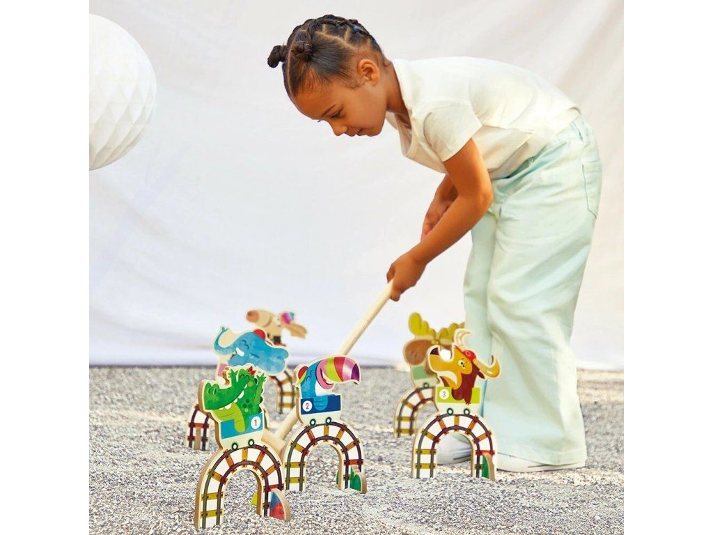 Túto vonkajšiu hru je možné používať v interiéri aj exteriéri, vďaka čomu je ideálnou voľbou na večierky, rodinné stretnutia alebo zábavné popoludnie doma.Paličky vhodné pre deti majú rozmery 9 x 3 x 51 cm. Naše zvieratká sa vo svojich autíčkach chystajú na bláznivú cestu! Niektoré nie sú veľmi sebavedomé, ale tvária sa odvážne, aby zažili a objavili nové pocity.