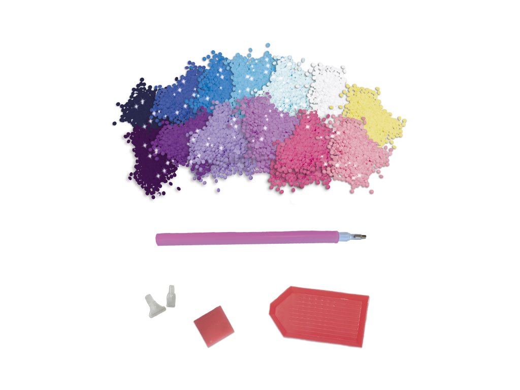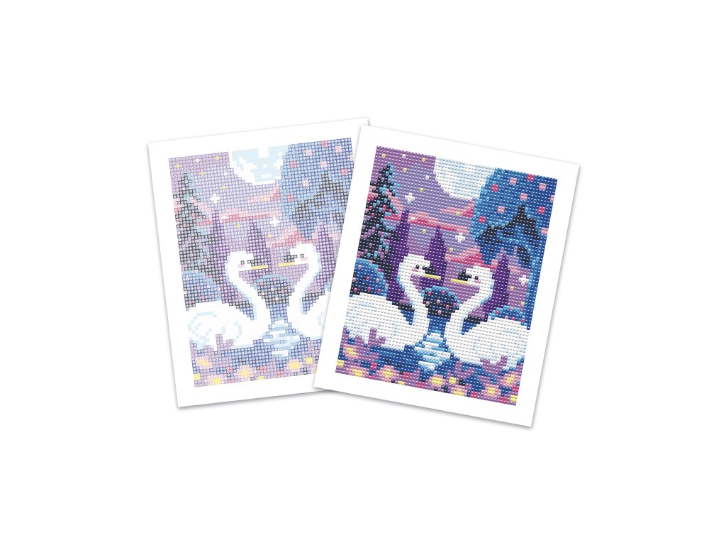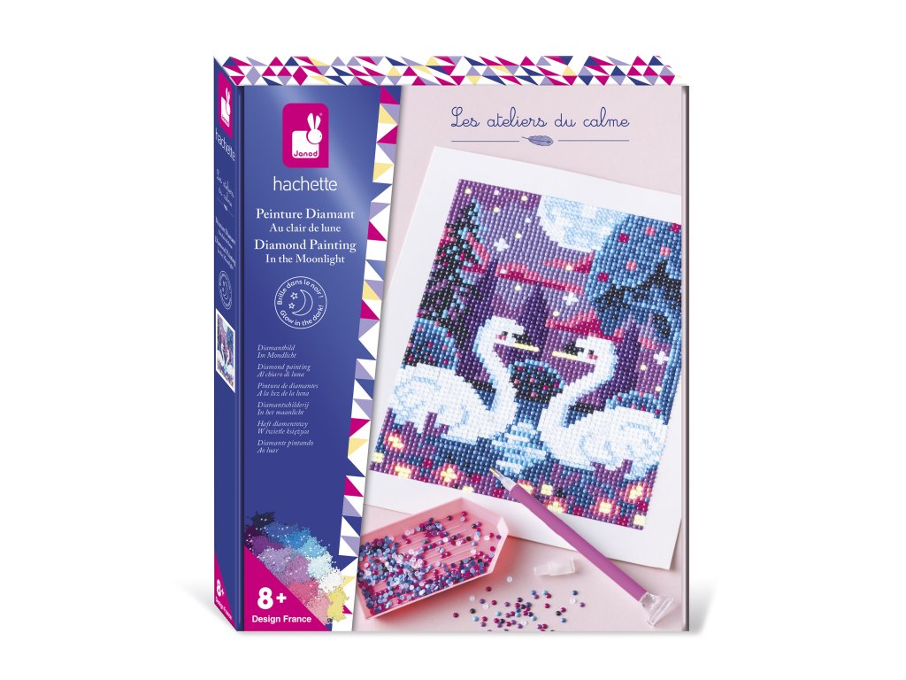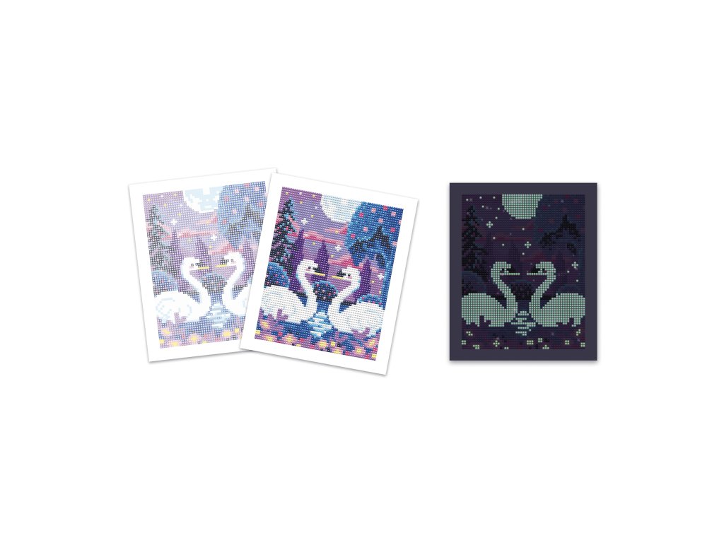 V mesačnom svite... Túto kreatívnu súpravu možno použiť na vytvorenie diamantového obrazu. Dizajn zobrazuje pár labutí v mesačnom svite. Súprava obsahuje 1 veľký samolepiaci obrázok (20,7 x 24,4 cm), 3900 mini kamienkov v 14 farbách (z ktorých 3 svietia v tme), 1 vŕtačku s 3 hrotmi rôznych veľkostí, 1 voskový štvorec, 1 drážkovaný podnos (na zarovnanie mini kamienkov v podnose) a 1 brožúrku s návodom a vzormi. Po dokončení obrázka sa dá krabica premeniť na krásny rámik na zavesenie vášho výtvoru. Vďaka fosforeskujúcim kamienkom budete môcť tieto labute obdivovať aj v tme! Táto aktivita pomáha rozvíjať trpezlivosť a pozornosť k detailom. Jej dokončenie trvá celkovo 3 hodiny (plus mínus) a je ideálna pre deti od 8 rokov.