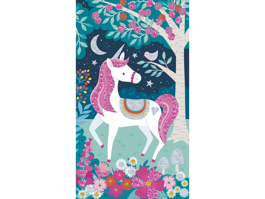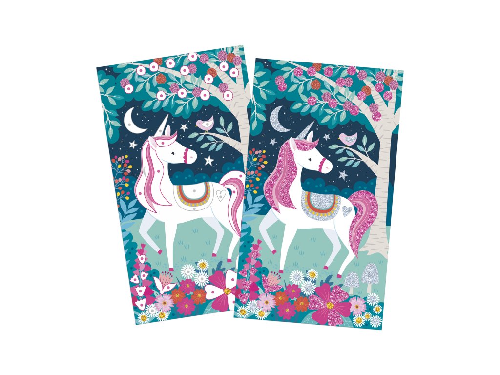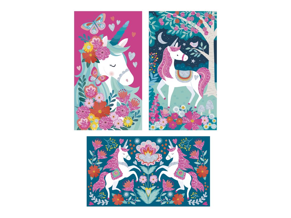 Videli ste už niekedy trblietavých jednorožcov? Táto sada na tvorenie obsahuje 3 obrázky s motívom jednorožcov, ktoré sa dajú ozdobiť trblietkami. Obsahuje 3 obrázky s vyznačenými oblasťami na ozdobenie, 2 tuby s trblietkami (striebornú a ružovú), 1 plastový nástroj a 1 brožúrku s návodom a vzormi. Táto aktivita, ktorá pomáha rozvíjať kreativitu a trpezlivosť, trvá približne 45 minút. Je ideálna pre deti od 6 rokov.