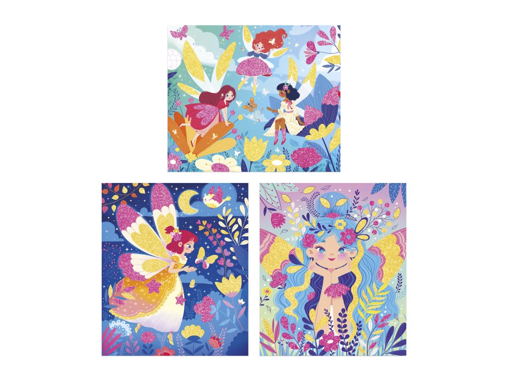 Čarovný svet... Táto sada na tvorenie sa dá použiť na ozdobenie 3 obrázkov s rozprávkovou tematikou trblietkami! Obsahuje 3 obrázky s vyznačenými oblasťami na ozdobenie (21 x 25 cm), 2 vrecká s trblietkami na zips (ružové a zlaté), 1 plastový nástroj s 2 rôznymi hrotmi (1 špicatý hrot na odlepovanie papiera chrániaceho oblasti na ozdobenie a 1 lyžičkovú špičku na vrátenie trblietok do vrecúšok) a 1 brožúrku s návodom a návrhmi. Táto aktivita, ktorá pomáha rozvíjať trpezlivosť a kreativitu, trvá približne 1 hodinu 30 minút. Je ideálna pre deti od 6 rokov.