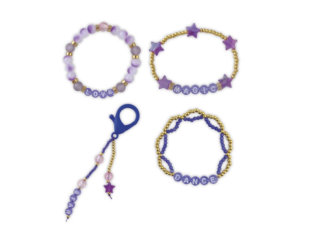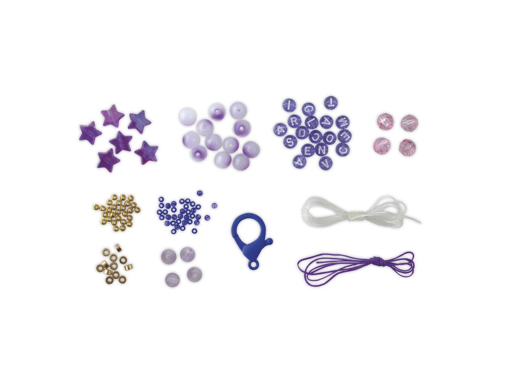 Staňte sa skutočnou popovou hviezdou! Vytvorte si 3 náramky a 1 kľúčenku, ktoré si môžete vymeniť s priateľmi, ak budete cítiť potrebu! Vďaka pôsobivému obsahu (18 fialových korálok s písmenami, 6 korálok s hviezdičkami, 12 zlatých kovových korálok, 120 okrúhlych zlatých kovových korálok, 60 modrých korálok, 4 korálky s ružovými fazetami, 4 priehľadné okrúhle korálky, 12 fialových korálok, elastická niť, fialová nefritová niť, 1 plastová spona na karabierku a 1 brožúrka s návodom a vzormi) bude táto sada ideálna pre tých, ktorí milujú šperky priateľstva. Táto aktivita, ktorá pomáha rozvíjať kreativitu a motorické zručnosti, trvá celkovo 50 minút (plus mínus). Je vhodná pre deti od 7 rokov.