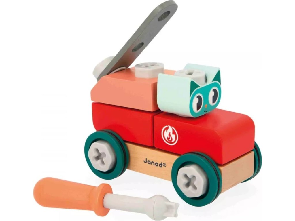 Janod BricoKids Drevená stavebnica auto s náradím Mačka 28 ks