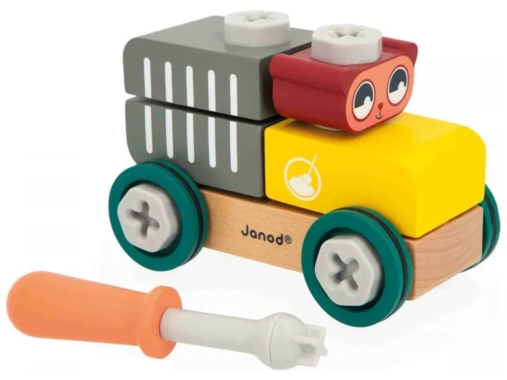 Janod BricoKids Drevená stavebnica auto s náradím Medveď 25 ks