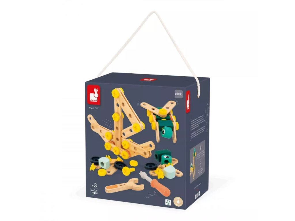 100-dielna stavebnicová súprava z kolekcie Brico'kids francúzskej značky JANOD je dokonalým darčekom pre malého kutila. Vďaka rôznym dreveným prvkom hračka podporuje rozvoj dieťaťa na mnohých úrovniach: rozvíja manuálne zručnosti, trpezlivosť, sústredenie, ale tiež podnecuje predstavivosť a sociálne zručnosti, čím podnecuje dieťa hrať scénky napodobňujúce správanie dospelých.