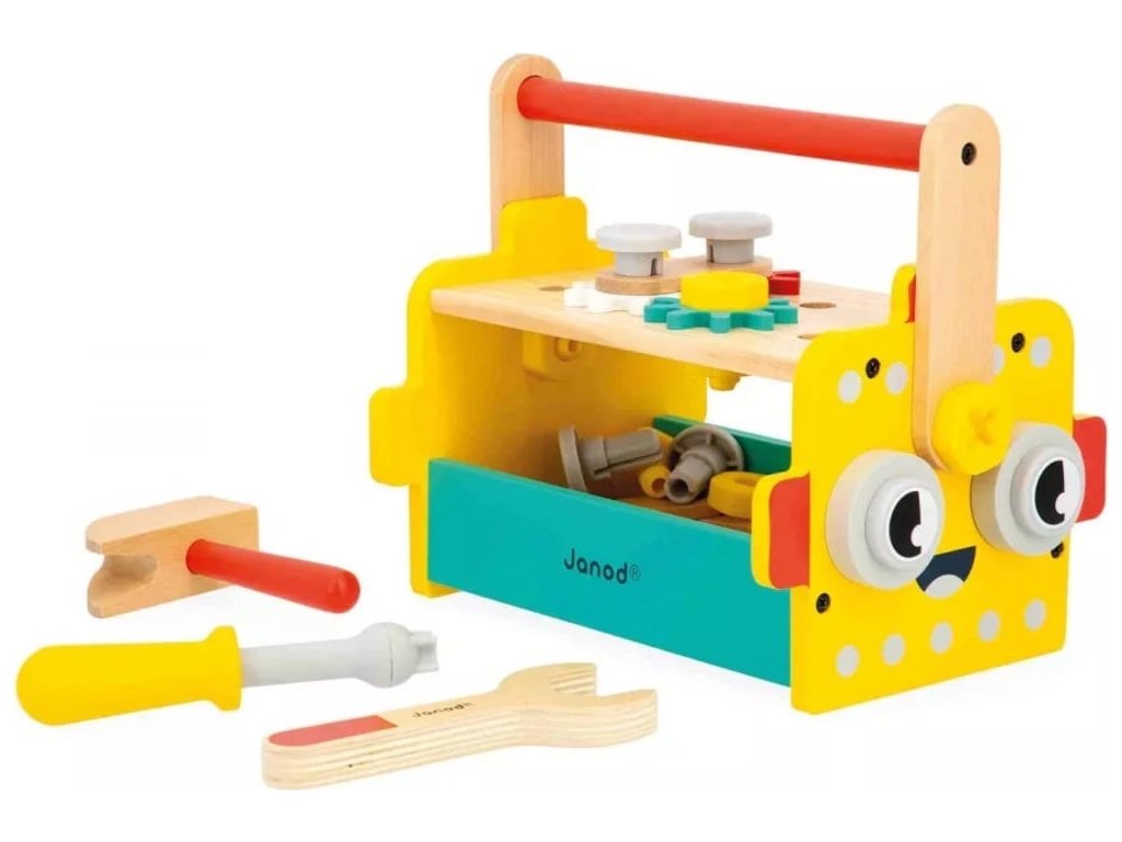 Janod BricoKids Drevené náradie a stavebnica v prenosnom boxe Robot 30 ks