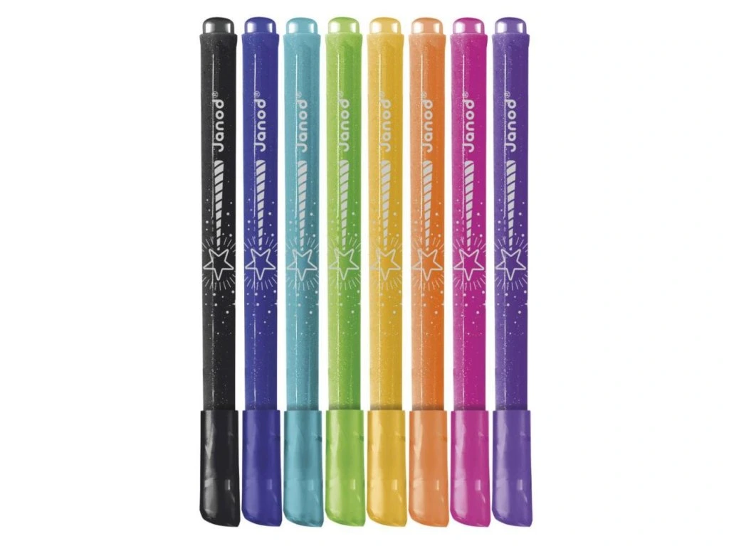 Čierna, tmavomodrá, svetlomodrá, zelená, žltá, oranžová, ružová, fialová: je to dúha farieb s trblietavou možnosťou! Keď píšete alebo kreslíte, všetko vyzerá oveľa magickejšie!