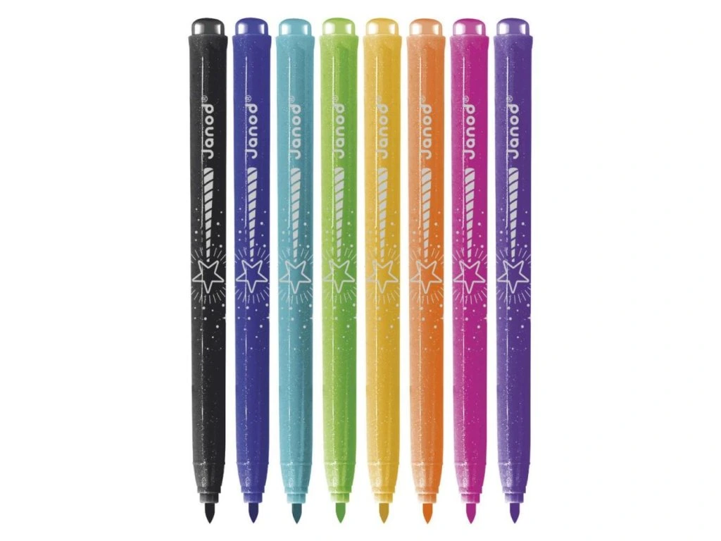 Dodajte kresbám iskru! Týchto 8 trblietavých plstených fixiek, vhodných pre deti vo veku 3 a viac rokov, ponúka paletu jasných farieb s nádychom trblietania pre úžasné kresby.