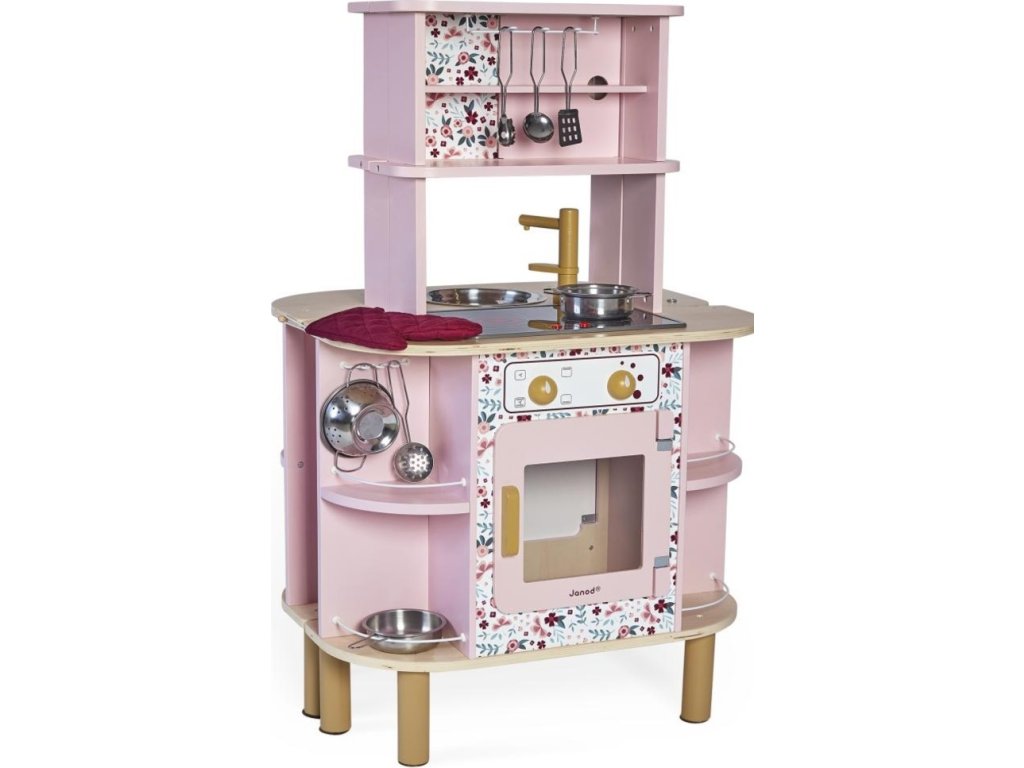 Je šikovne vybavená kovovým drezom, drevenou batériou a indukčnou varnou doskou so zvukom a svetlom.