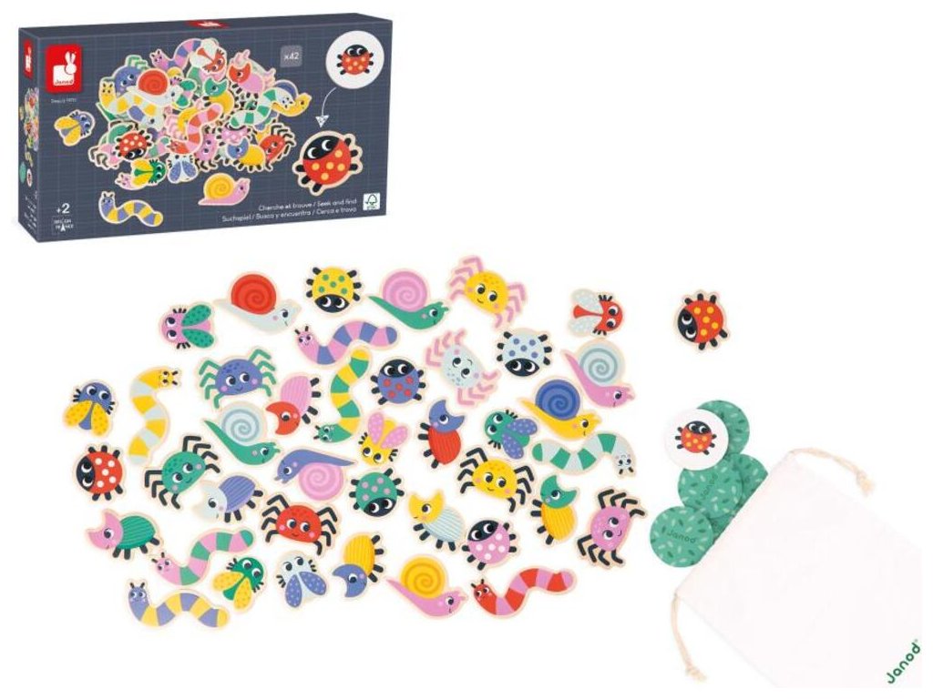 Rovnako ako stolovú hru, aj túto hru Hľadaj a nájdi sa môžu hrať dvaja ľudia: dospelý verbálne opíše tvar a farbu hmyzu, potom ho musí dieťa nájsť v kôpke. Viaceré deti sa tiež môžu spolu hrať tak, že sa budú striedať alebo spolupracovať pri hľadaní malých stvorení! V „nezávislom“ režime si vaše dieťatko môže vytiahnuť kartu a nájsť si to správne zvieratko.