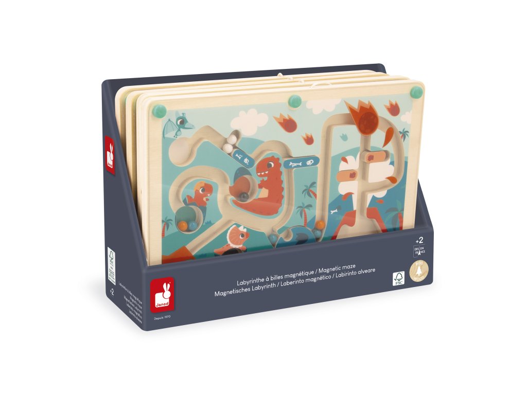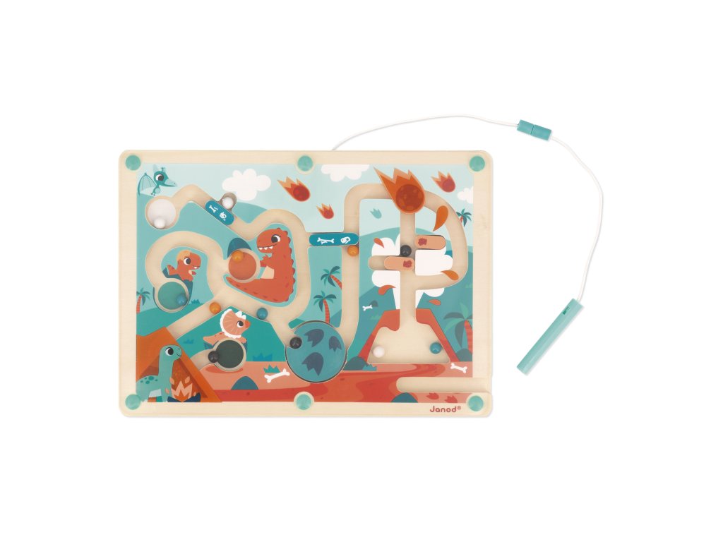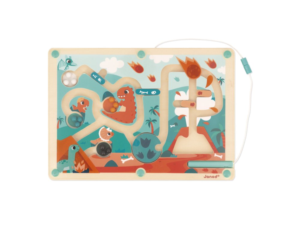 Vitajte v Jurskom svete! Svet obývaný dinosaurami. Prejdite cez bludisko zo sopky a pomocou magnetického stylusu prineste 12 farebných guľôčok do príslušnej zóny. Dávajte si pozor na prekážky! Budete tiež musieť použiť turniket, aby ste sa vyhli uviaznutiu a pridali sa k malým dinosaurom! Rozvíja jemnú obratnosť. Hračka vyrobená z dreva FSC pre deti od 2 rokov.