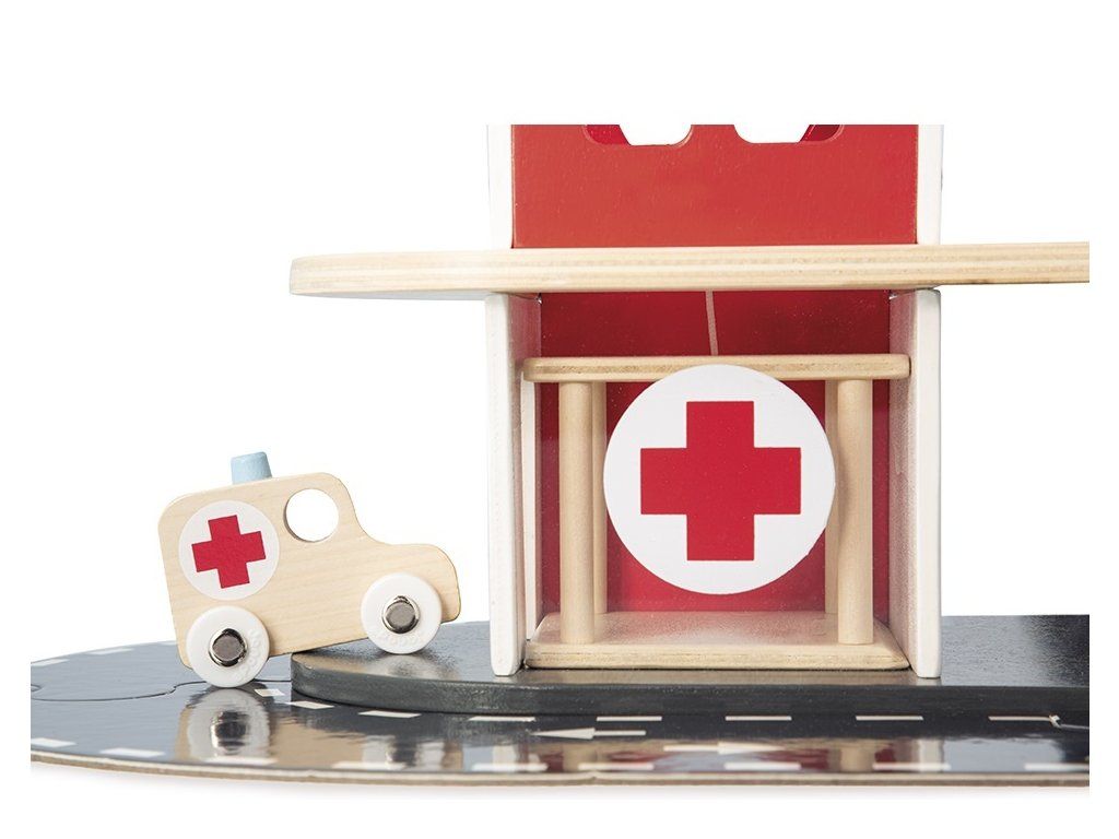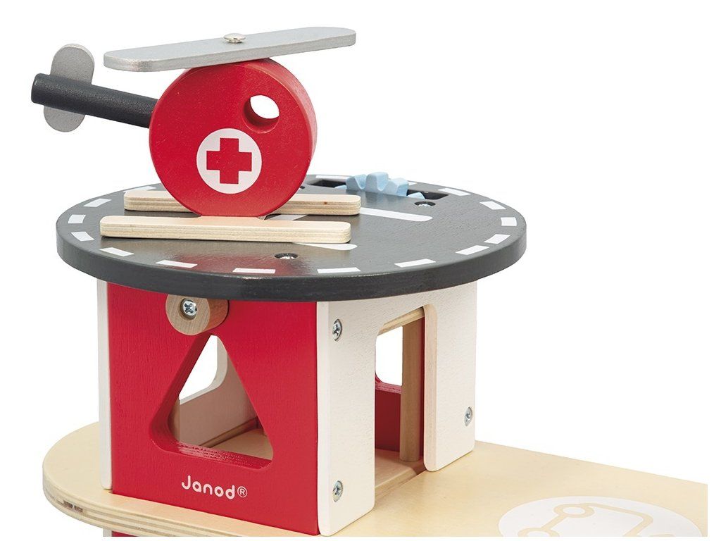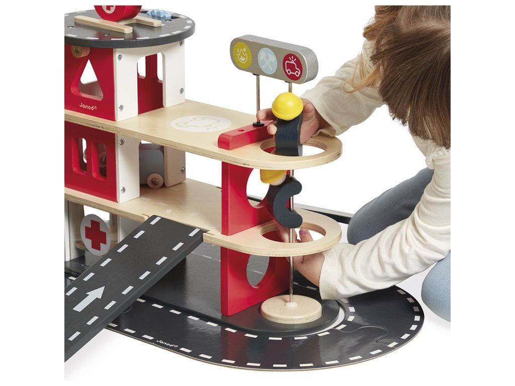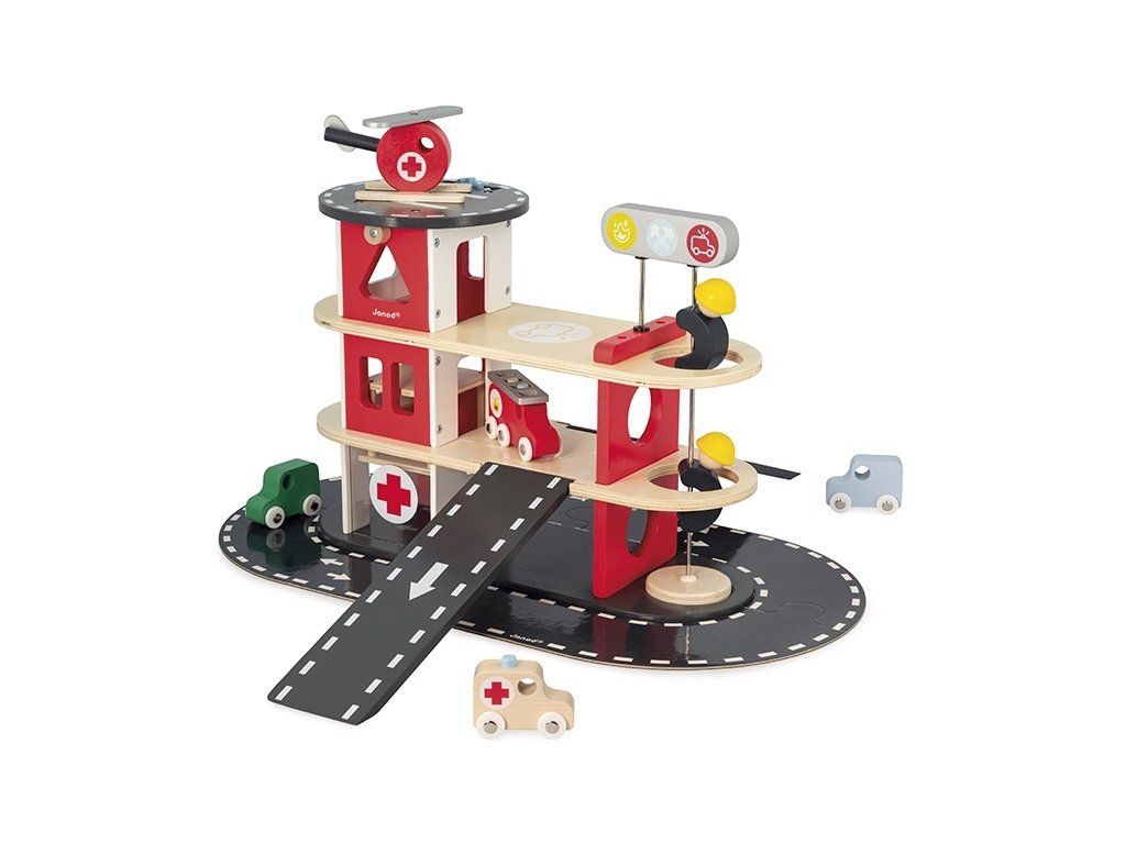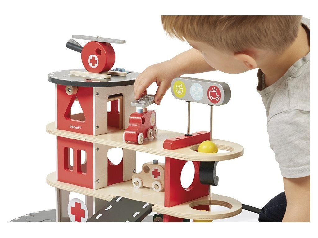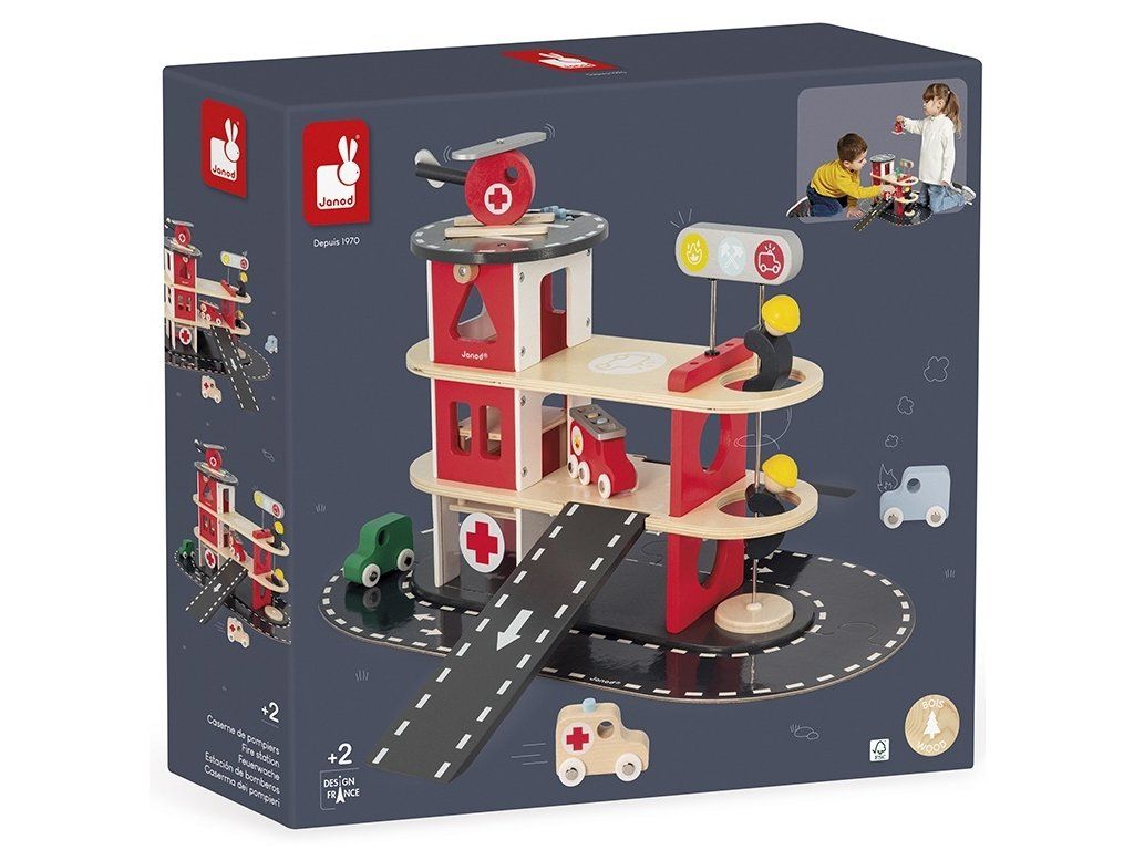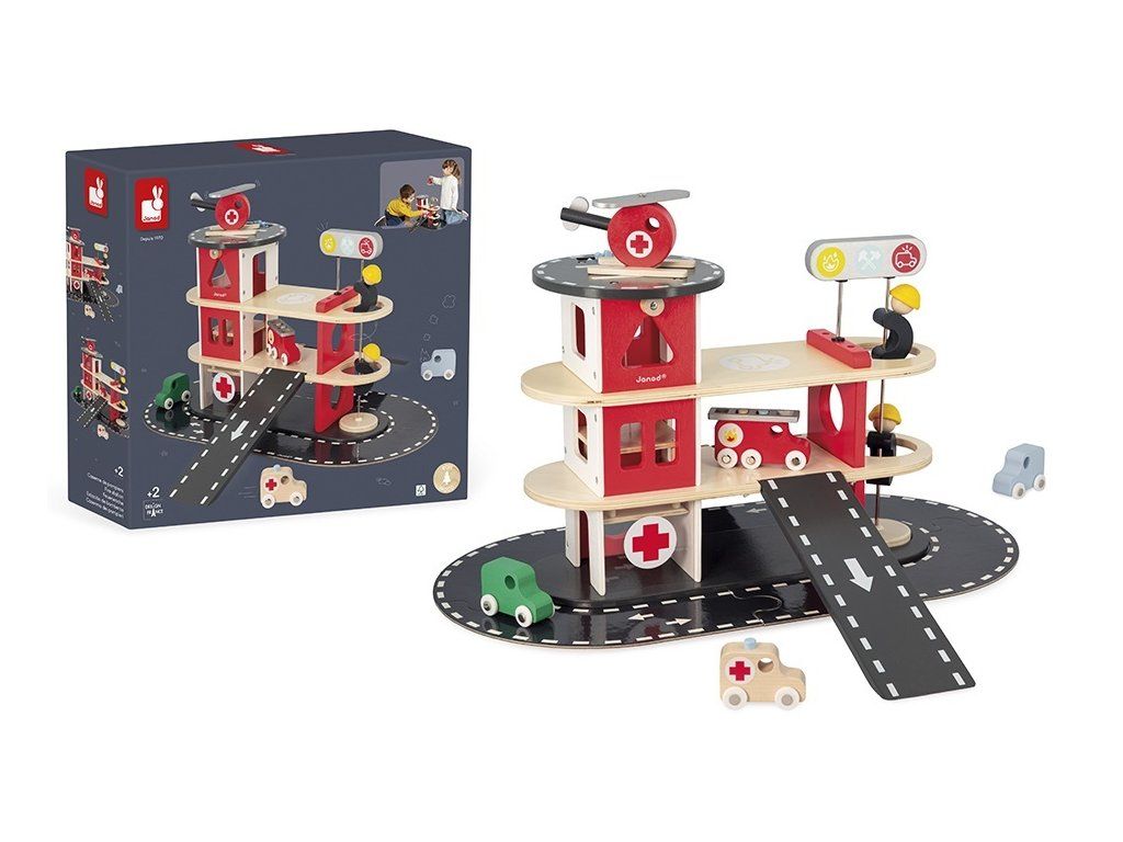 Siréna zaznie, nechajte hasičov prejsť! Nechajte svoje dieťa objavovať každodenný život hasičov. Táto šikovná drevená hasičská stanica pozostáva z 2 hasičov, ktorí sa môžu skĺznuť po tyči, vrtuľníka a 4 vozidiel: 2 áut, 1 sanitky a 1 hasičského auta s odnímateľným rebríkom. Všetci môžu používať rampy, výťah a okruh okolo hasičskej stanice, aby sa dostali na miesto požiaru!
