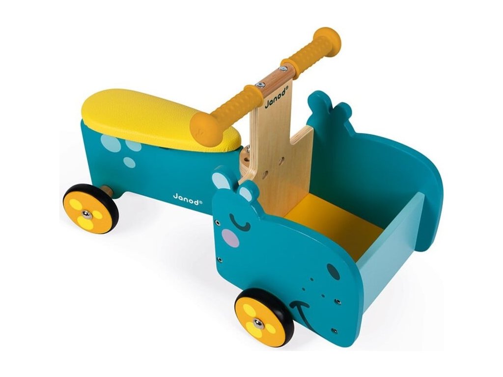 Drevené odrážadlo pre najmenších Hroch Janod s vozíkom na hračky. Táto krásna a trendová hračka v tvare hrocha je ideálna pre rozvoj motorických schopností a rovnováhy vášho dieťaťa.