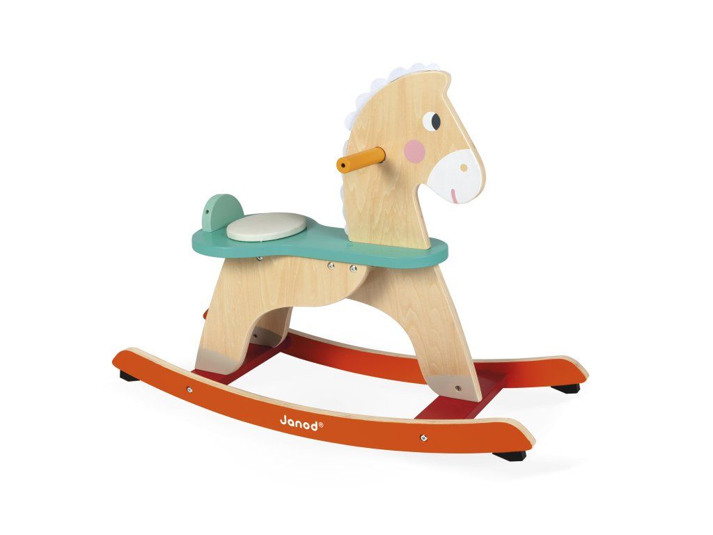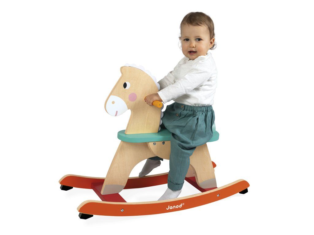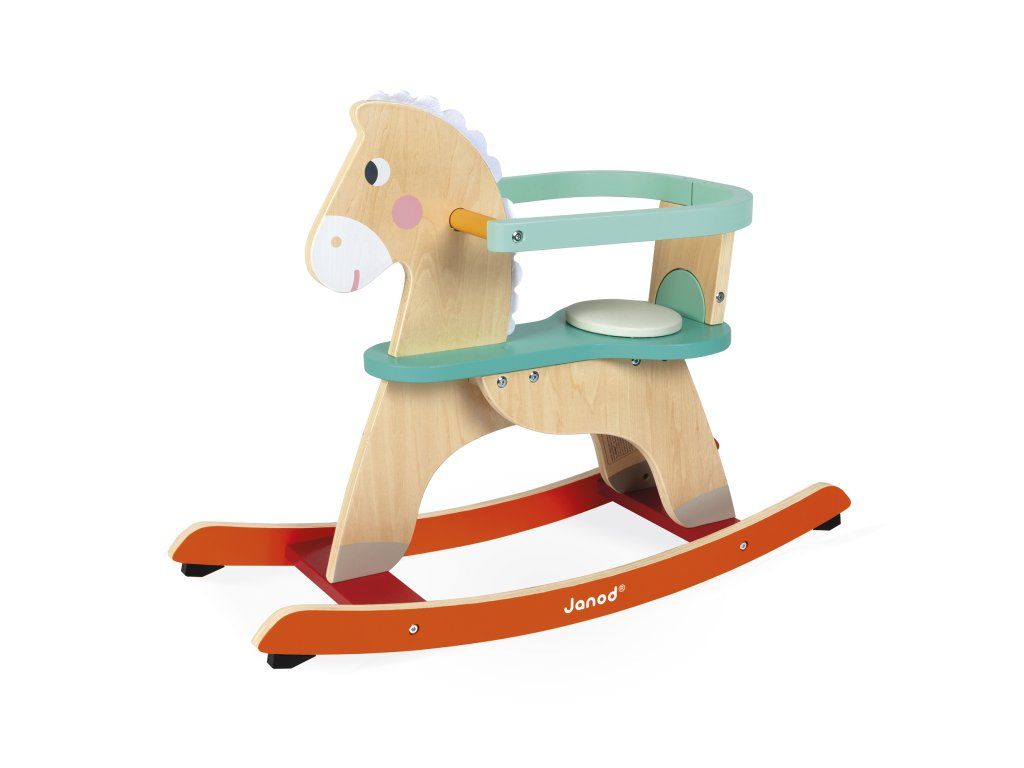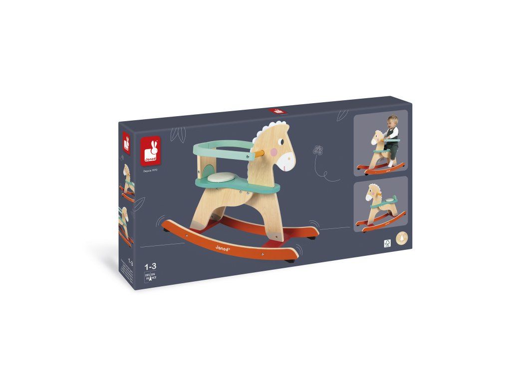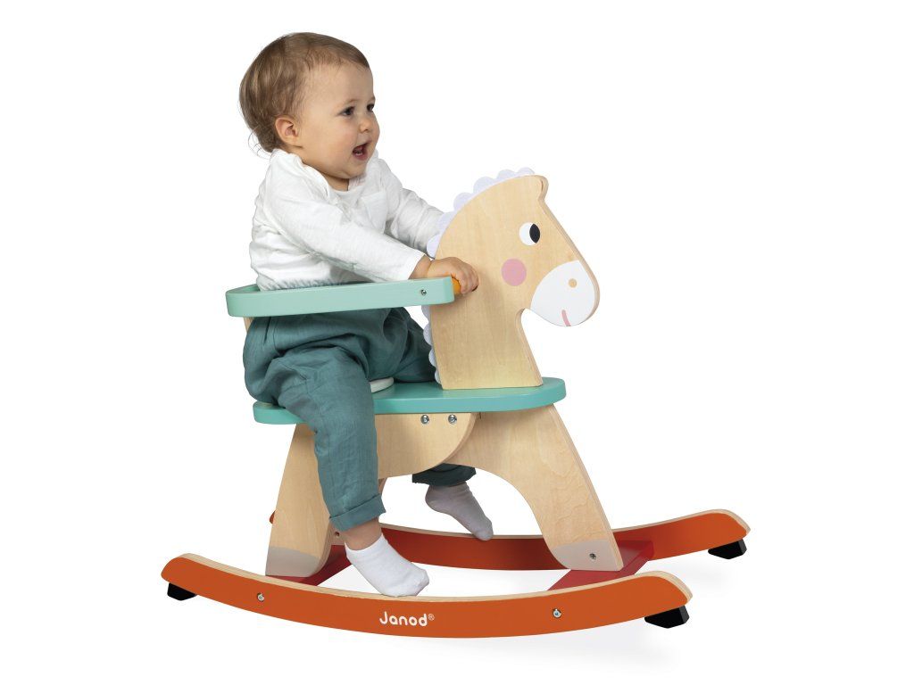 Čas osedlať! Tento kôň už len čaká, kým sa jeho džokej vydá na cval! Tento krásny drevený hojdací kôň vezme najmenších na imaginárne jazdy plné prekvapení. Je vybavený odnímateľným postrojom, ktorý chráni najmenších, a po jeho odstránení poskytuje starším deťom väčšiu slobodu. Má tiež gumené protiprevrátiace podložky vpredu a vzadu, ktoré zabezpečujú hodiny jemnej hry. Ideálne na rozvoj hrubej motoriky, rovnováhy a predstavivosti. Hračka vyrobená z dreva s certifikátom FSCTM. Hračka pre rané vzdelávanie detí od 12 do 36 mesiacov.