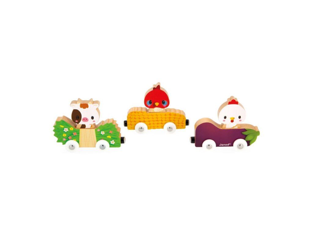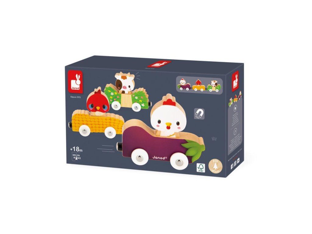 Zvieratá žijúce na lúke aj v maštali milujú preteky na farme! Táto magnetická hračka sa skladá z 3 áut (baklažán, kukurica a poľné kvety) a 3 drevených postavičiek (kura, moriak a krava).