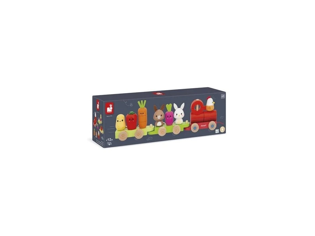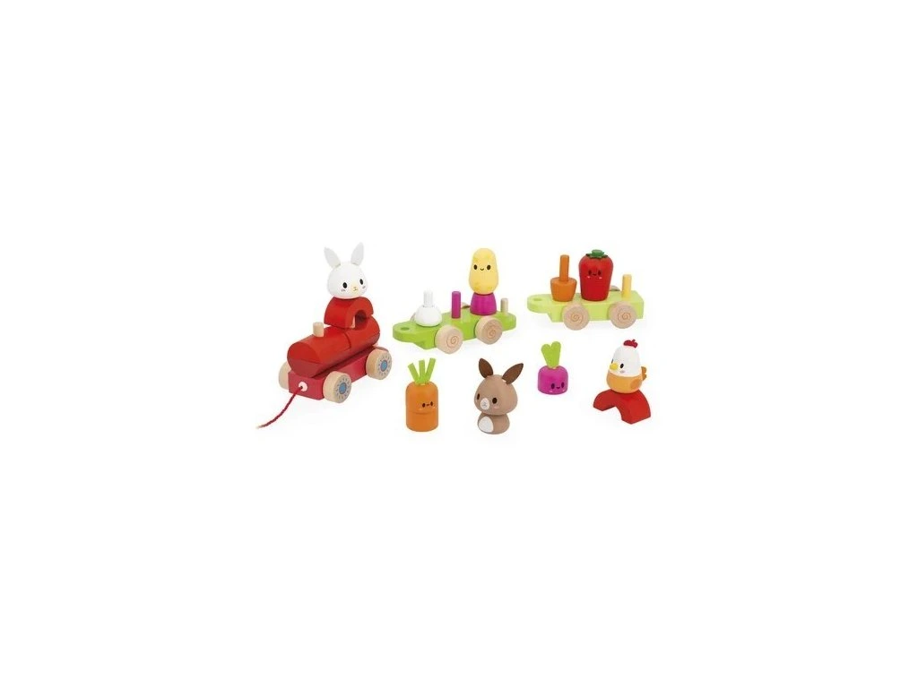 Pekný drevený vláčik s 3 vagónikmi a 19 dielikmi, ktoré je možné zostaviť a vytvoriť tak zeleninu zo zeleninovej záhrady (zemiaky, paradajky, mrkva a reďkovka) a zvieratká z farmy (králika a kuracie mäso).