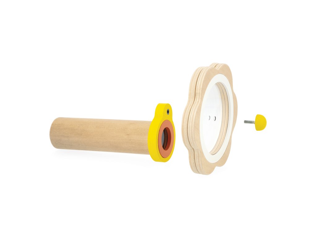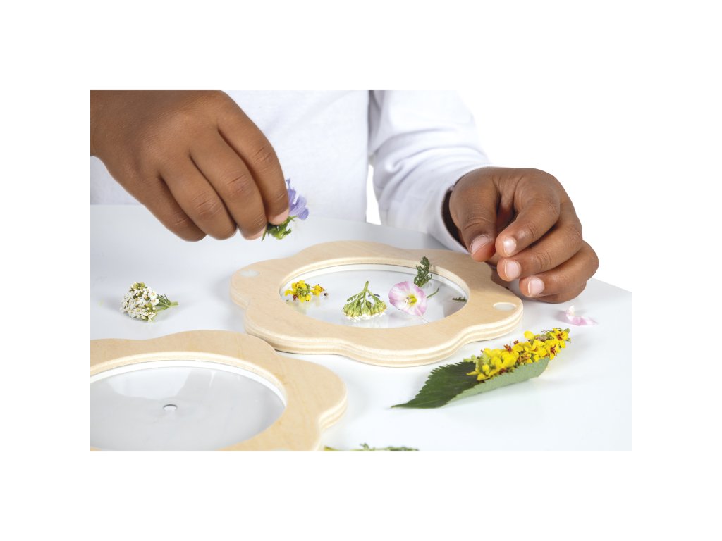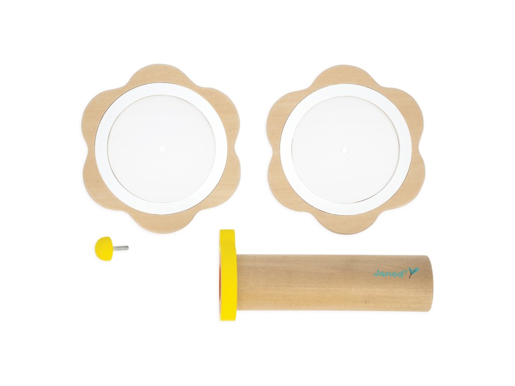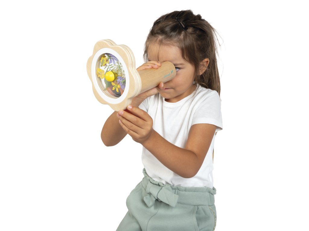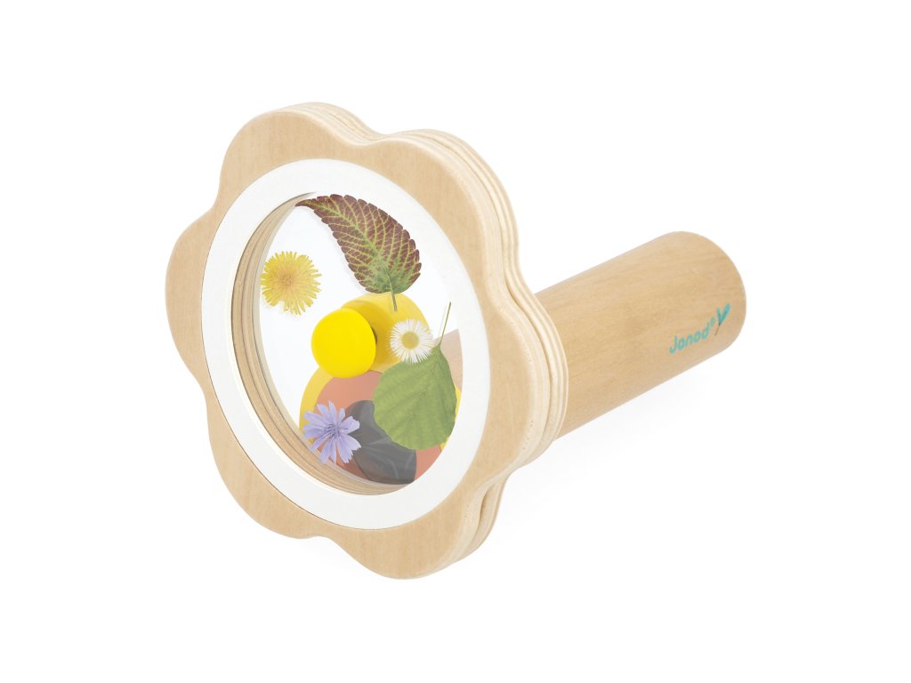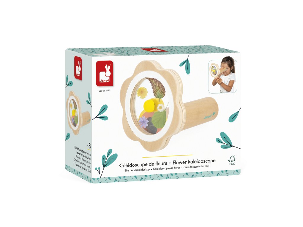 Vyberajte, skladajte, pozorujte... a nechajte sa čarovať! S týmto krásnym kaleidoskopom môžu deti vytvárať nádherné psychedelické vzory s použitím skutočných kvetov, iných rastlín alebo akéhokoľvek iného materiálu s rôznymi farbami a tvarmi. Jednoducho vložte to, čo ste našli, medzi dva magnetické panely v tvare kvetu, priskrutkujte ich k drevenej rukoväti a potom celé otočte, aby ste mohli obdivovať krásnu show. Pozorovacia hračka, ktorá rozvíja fantáziu a podporuje objavovanie prostredia. Hračka vyrobená z dreva s certifikátom FSCTM. Hračka pre deti od 3 rokov.