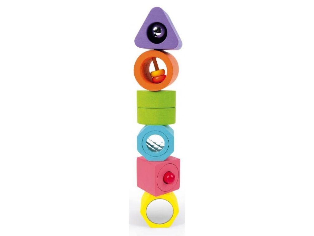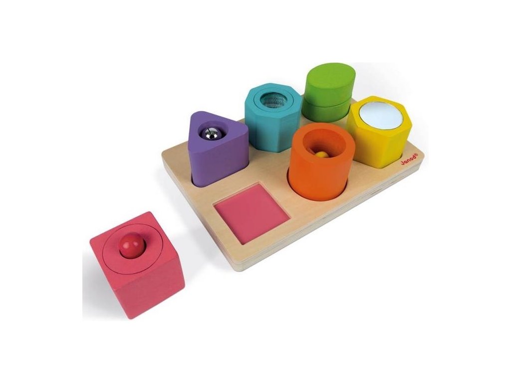 Drevené vkladačka pre najmenšie deti s ktorou sa učia rôzne tvary a farby. Každý dielik vydáva nejaký zvuk alebo má iný aktívny prvok ako napr.zrkadielko a podobne.