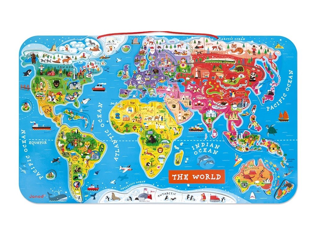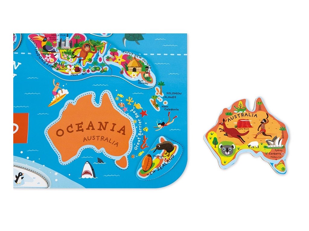 Krásna magnetická mapa sveta obsahuje 92 drevených dielikov puzzle, kde každý z nich reprezentuje región alebo krajinu, nesie názov hlavného mesta a obsahuje obrázok charakterizujúci dané miesto (významné stavby, pamiatky, zvieratá a rastliny z danej oblasti).