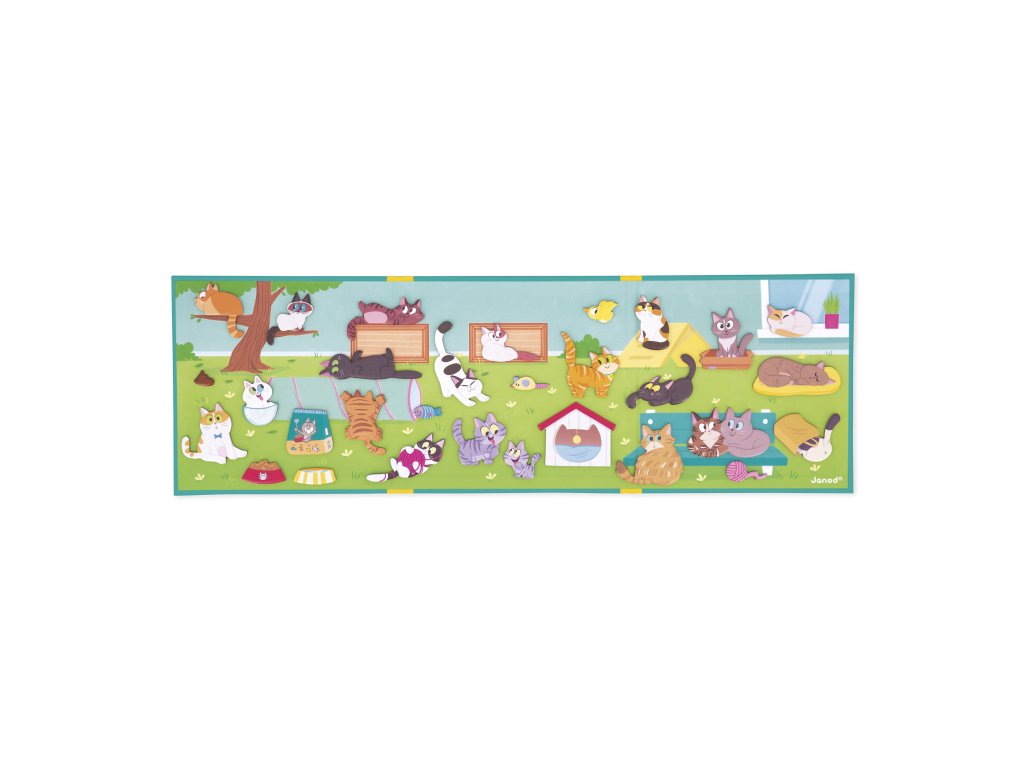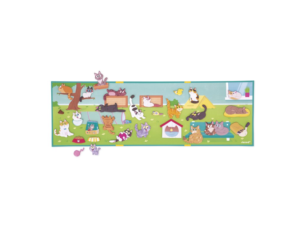 Nechajte svoju fantáziu priať s touto kolekciou mačiek! Každá má svoje obľúbené miesto: na konári, v košíku alebo dobre skrytú! Vďaka veľkému magnetickému pozadiu a 30 magnetom si vaše dieťa môže vymýšľať vlastné príbehy presúvaním mačiek podľa vlastného uváženia. Prenosný formát, ktorý je ideálny na hranie kdekoľvek a znova a znova. Hra, ktorá stimuluje fantáziu, kreativitu a jemnú motoriku. Magnetická hračka vyrobená z kartónu FSCTM. Hračka pre deti od 3 rokov.