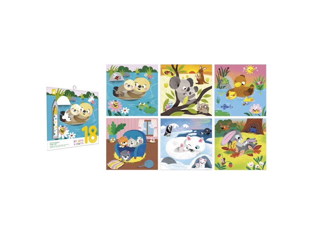 Táto sada na tvorenie zahŕňa vyfarbovanie obrázkov s tematikou túlenia zvieratiek vodným perom. Obsahuje 3 obojstranné podložky, napr. 6 scén, ako aj vodné pero a leták s pokynmi a vzormi. Obrázky sú farebné s bielymi plochami. Farby sa objavia vo vode a pri schnutí blednú. Umožňuje deťom začať odznova! Táto aktivita pomáha rozvíjať jemnú motoriku a trpezlivosť. Trvá približne 20 minút (kým obrázky zaschnú a budú opäť použiteľné) a je ideálna pre deti vo veku 18 mesiacov a viac.