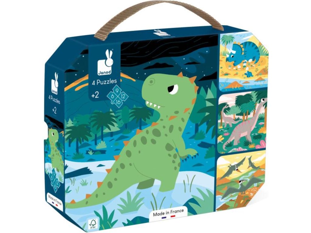 Janod Puzzle v kufríku 4v1 Dinosaury 6-9-12-16 ks