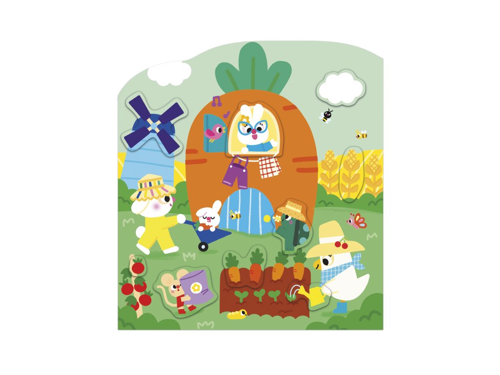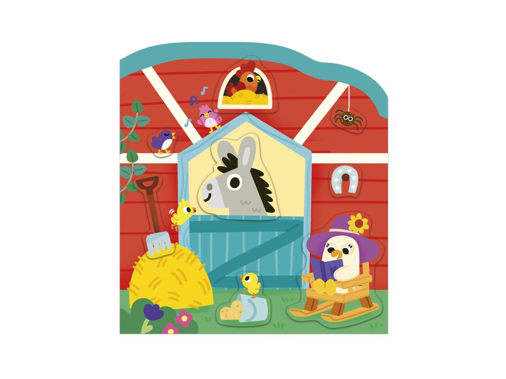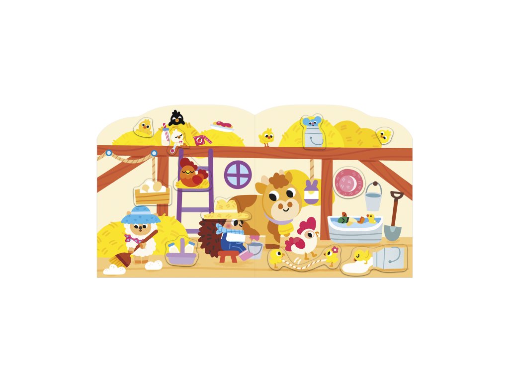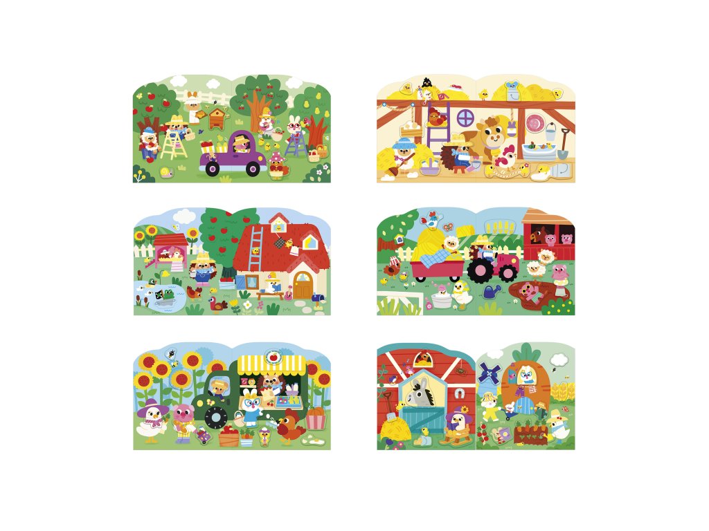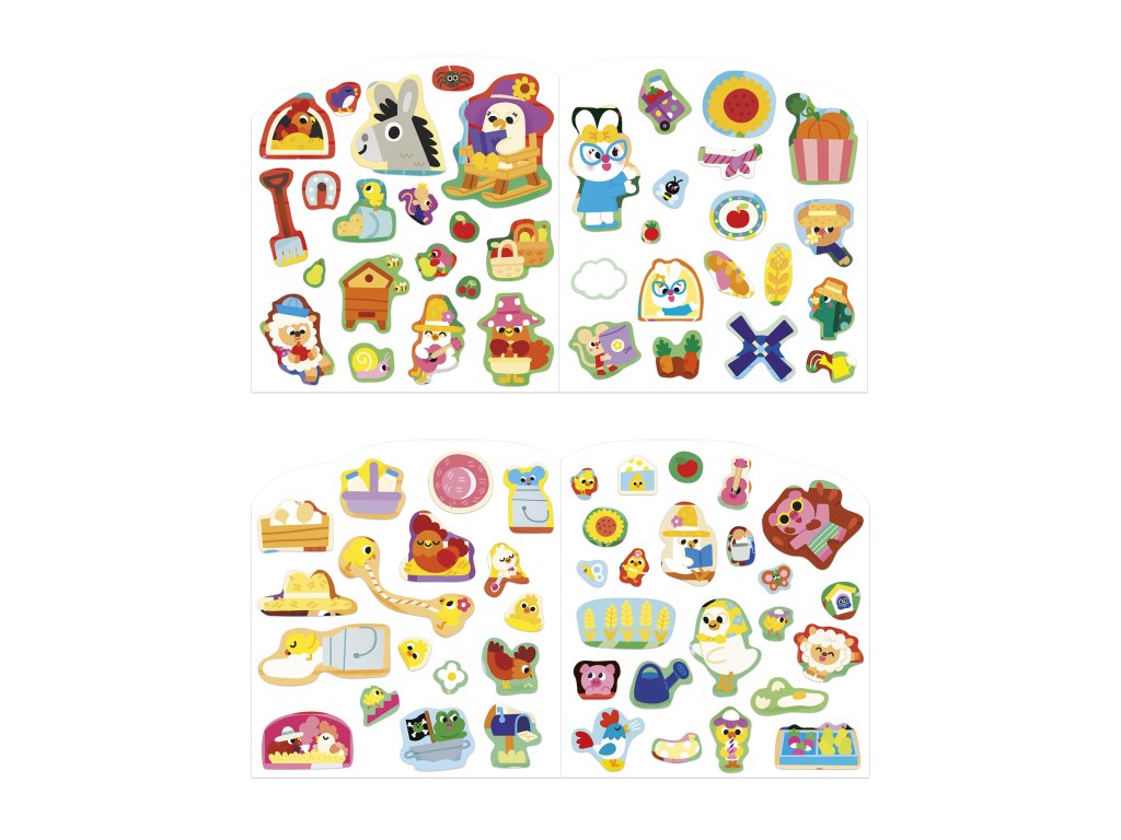 Vitajte na farme! Tento tvarovaný zošit obsahuje 12 strán s ilustráciami s farmárskou tematikou, ktoré je potrebné doplniť 8 stranami s priloženými nálepkami, čo predstavuje spolu 70 nálepiek. Otvory pre nálepky sú označené bledšou farbou, vďaka čomu sa ľahšie identifikujú. Každá nálepka sa pýši jednoduchým tvarom bez orezávania, vďaka čomu sa ľahko uchopí. Ľahko sa lepia a odlepujú a nachádzajú sa na zošitých listoch v zošite. Táto aktivita pomáha rozvíjať trpezlivosť a jemnú motoriku. Je ideálna pre deti od 3 rokov.