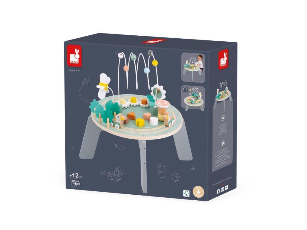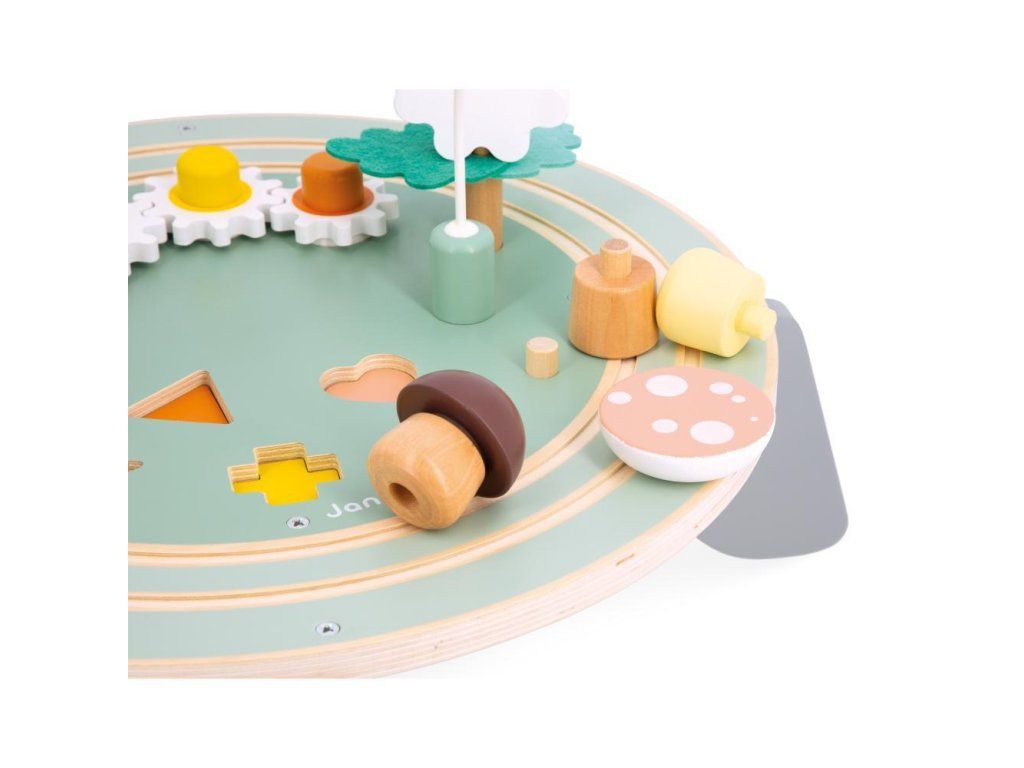 Na tomto stolíku aktivít nájdete: obriu hríbovú hríbku, 5 kusov hniezd, les plstených listov, obrovskú stohovaciu sedmokrásku so zrkadlom na vrchu na obdivovanie seba samého, 1 veľké počítadlo, 3 ozubené kolesá v tvare kvetu, veterný mlyn, ktorý otočí, keď kačica prejde popod ňu, a hríb, ktorý vydáva cvakavý zvuk. Celkovo je k dispozícii viac ako 8 aktivít, ktoré zaručia hodiny zábavy a hier pre najmenších!