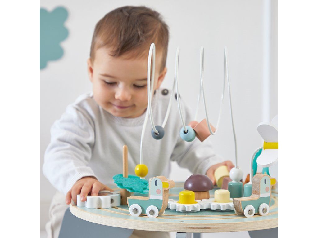Tento stolík rastie s dieťaťom a nohy je možné nastaviť do vysokej polohy (výška dosky: 22 cm) alebo nízkej polohy (výška dosky: 13 cm). Veľmi pohodlné! Ideálna hračka na rozvoj jemnej motoriky bábätka.