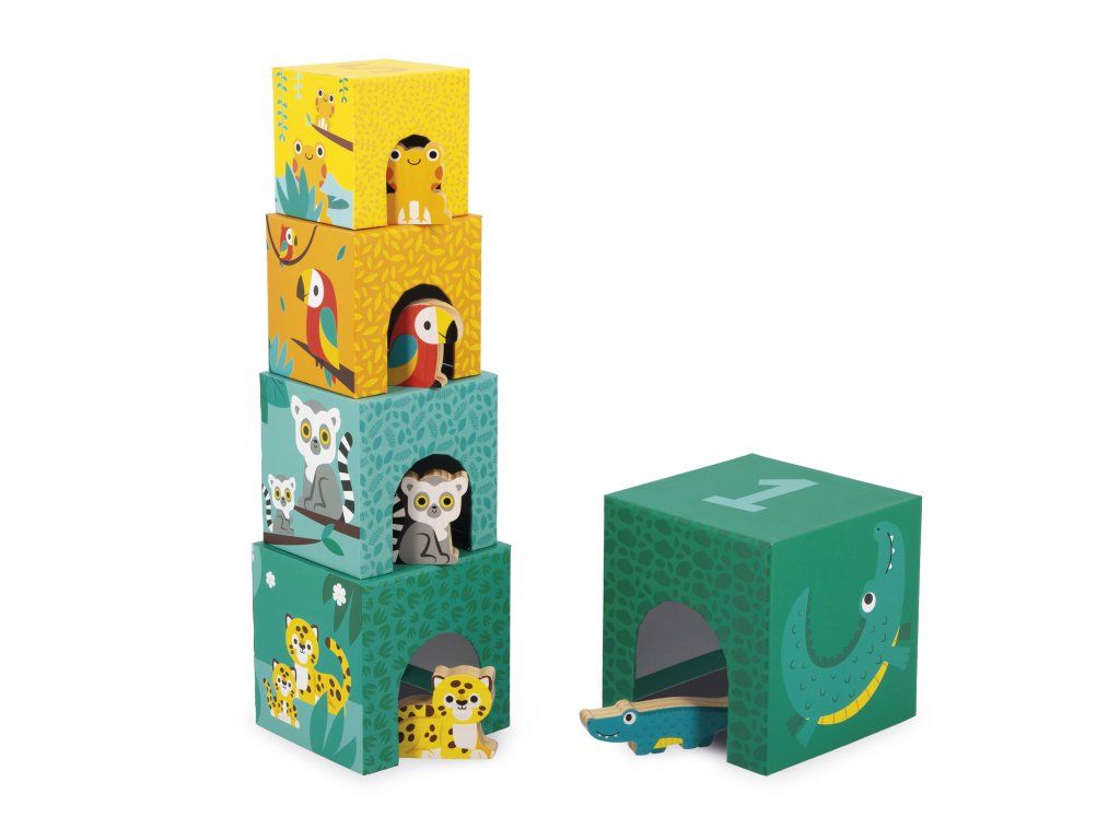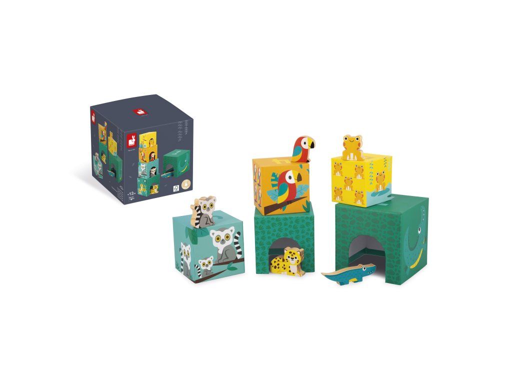 Vitajte v džungli! Tu je naša atraktívna pyramída zložená z 5 kartónových blokov a 5 drevených zvieratiek (krokodíl, jaguár, lemur, papagáj a žaba). Každá kocka predstavuje zviera rôznej veľkosti a je očíslovaná od 1 do 5, aby sa deti mohli učiť počítať a zároveň sa baviť! Na boku počet zvieratiek zodpovedá číslu na kocke. Nakoniec, vďaka ilustráciám a otvorom, vaše dieťa bude môcť nájsť, ktorá kocka patrí ktorému zvieraťu a schovať ju dovnútra. Rozvíja jemnú motoriku a koordináciu ruka-oko. Hračka vyrobená z dreva a kartónu s certifikátom FSCTM pre deti od 12 mesiacov.
