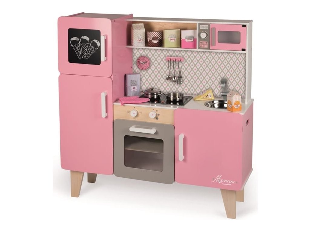 Súčasťou veľkej ružovej kuchynky Macaron Janod je až 15 doplnkov, vrátane chňapky, hrncov, lopatky a naberačky, potraviny zabalené v drevených krabičkách a volské oko. Vstavanou súčasťou kuchynky je polička, hodiny, vešiak na varešky, mikrovlnka, varná doska, rúra a drez.