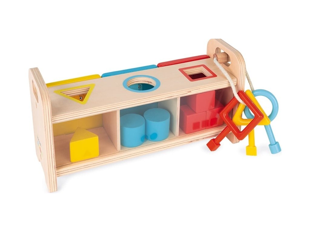 Ďalej sa dieťa môže učiť vkladať, poznávať farby, tvary alebo počítať. Táto hra je vyrobená z masívneho dreva a obsahuje tri rôzne zámky na otvorenie.