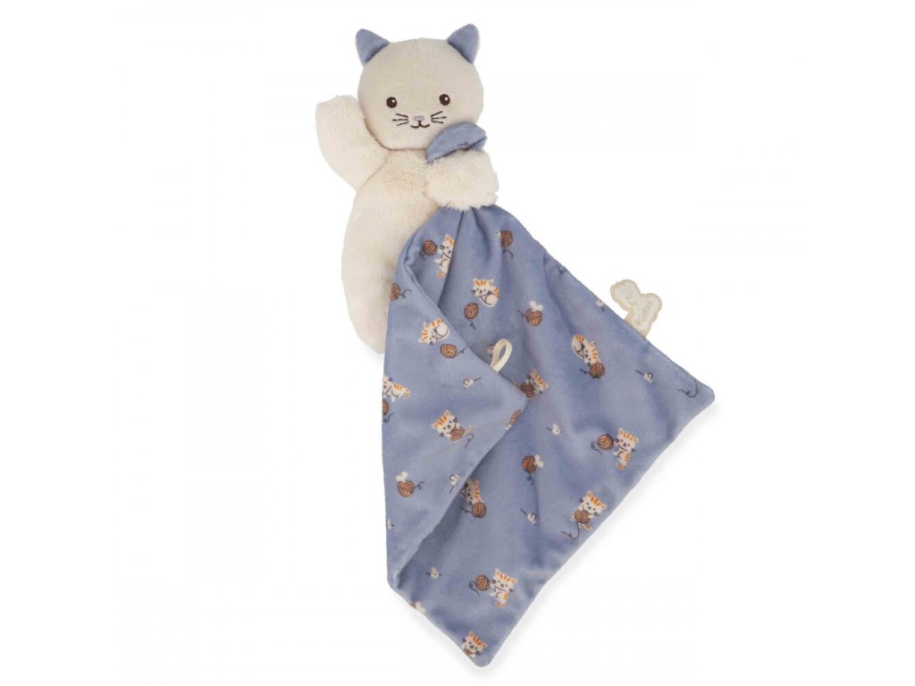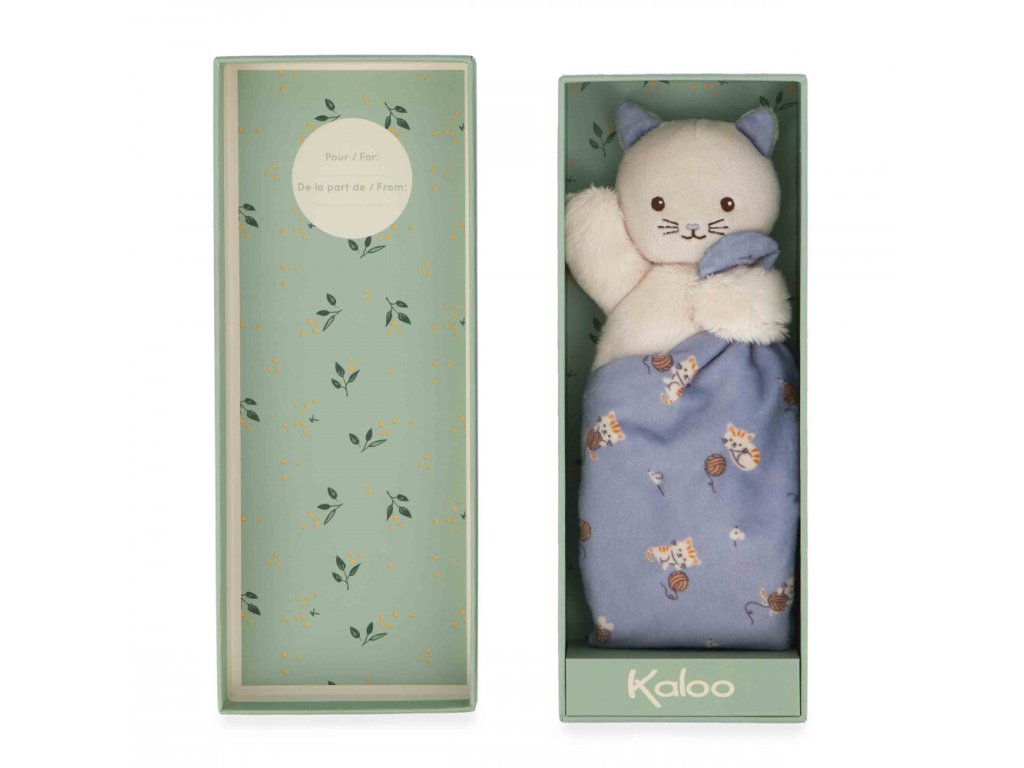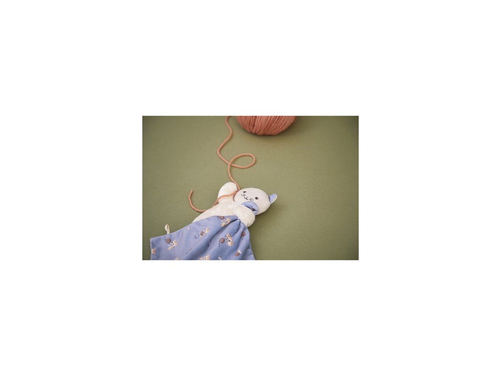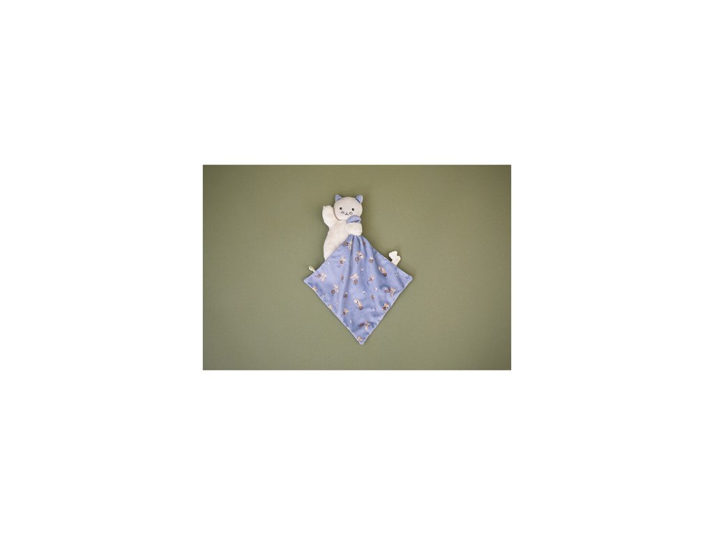 Produkt kombinuje roztomilú plyšovú hlavičku mačičky a štvorcovú dečku s rozmermi 20 cm. Dečka je zdobená jemnou potlačou s prírodným motívom (vážky), ktorá dodáva hračke elegantný vzhľad. Je vyrobená z vysoko kvalitných materiálov, pričom až 97 % zloženia tvoria recyklované materiály a výplň. Vďaka kompaktným rozmerom a ľahkosti je ideálna pre drobné detské rúčky, ktoré ju môžu ľahko uchopiť a túliť sa k nej. Mačička je zabalená v krásnej darčekovej krabičke, ktorú je možné personalizovať menom dieťaťa pod vekom.