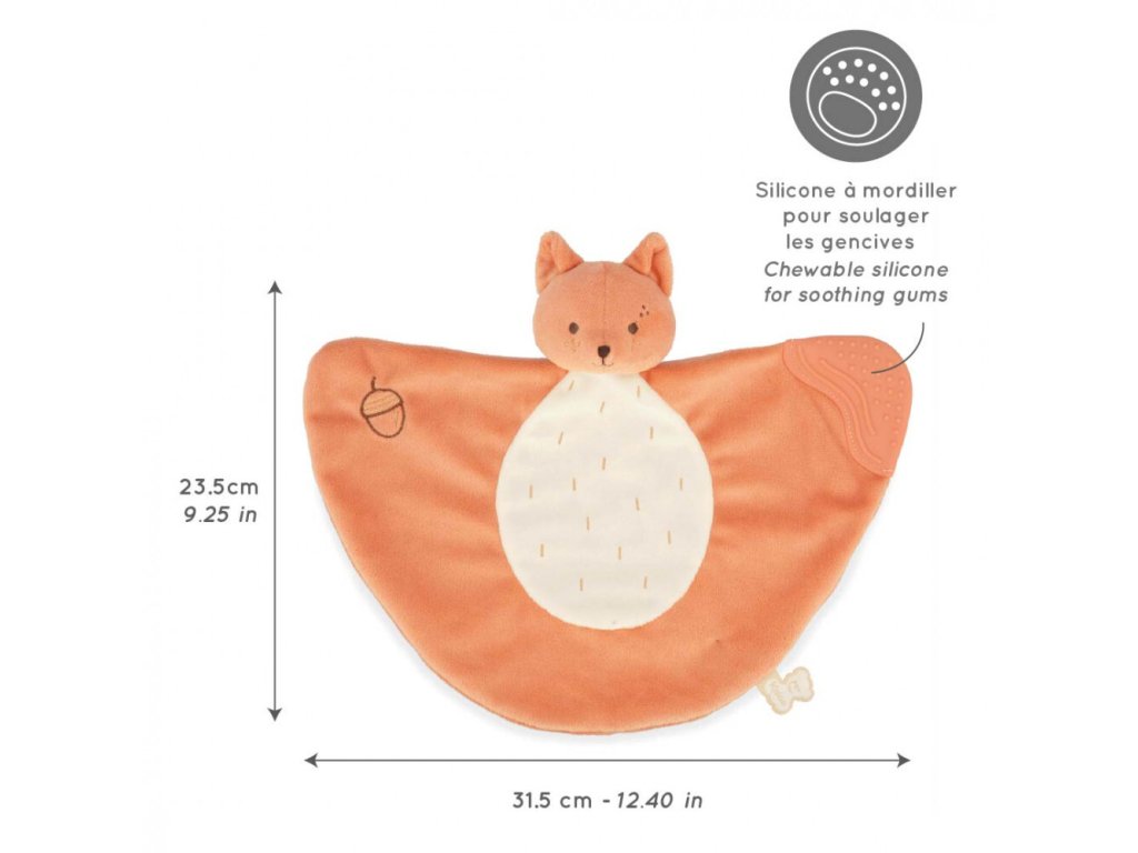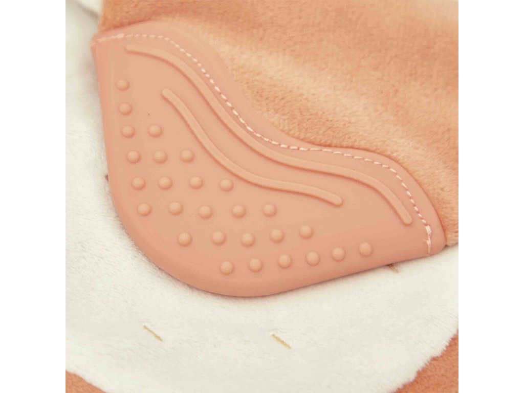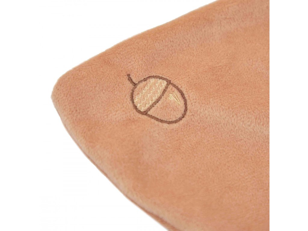 Hračka z kolekcie Grignoti je vyrobená z mimoriadne jemného mikrozamatu, ktorý je veľmi príjemný na dotyk. Na jednom konci hračky sa nachádza poddajná silikónová časť s textúrou (drážkami a výstupkami), ktorá je ideálna na žuvanie a jemnú masáž citlivých ďasien. Veverička má hrejivú oranžovú farbu a je zdobená detailnou výšivkou lieskového orieška, čo dodáva hračke hravý a originálny charakter. Vďaka svojej veľkosti a ľahkosti je ideálna do malých detských rúk.