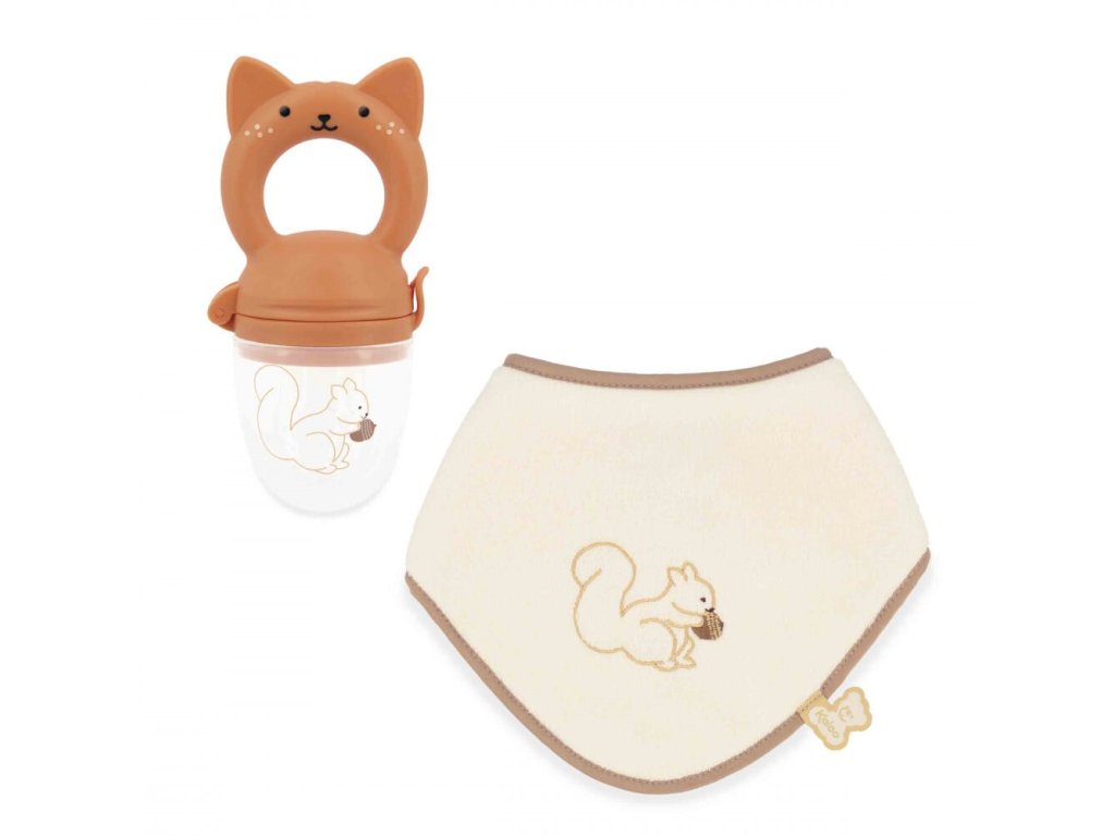 Kaloo Grignoti - Sada podbradníka a kŕmidla veverička je ideálny set pre bábätká, ktoré začínajú objavovať nové chute a textúry jedla. Táto praktická darčeková sada obsahuje krmítko na čerstvé ovocie a zeleninu a ladiaci podbradník, čo z nej robí skvelého pomocníka na obdobie prvých príkrmov.