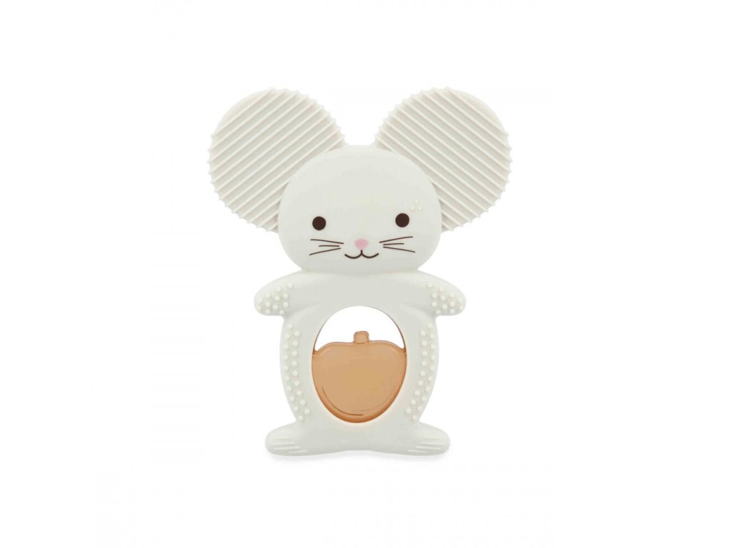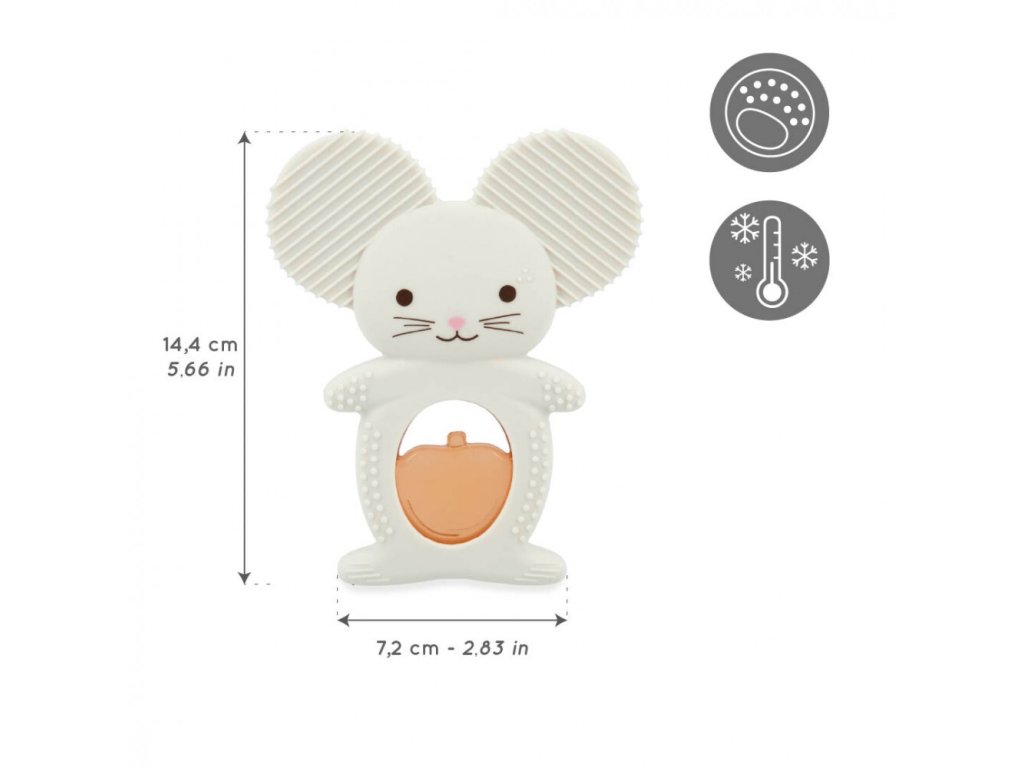 Duo obsahuje mäkký silikónový krúžok v tvare bielej myšky a chladiaci element v tvare jablka naplnený vodou. Po vložení „ovocia“ do chladničky na 10 až 20 minút poskytuje hračka príjemný chladivý efekt, ktorý redukuje bolesť a opuch ďasien. Rôznorodé textúry, výstupky a drážky na uškách a tele myšky jemne masírujú ďasná a stimulujú hmat. Ergonomický tvar je prispôsobený malým detským rúčkam, čo uľahčuje úchop a podporuje rozvoj jemnej motoriky.