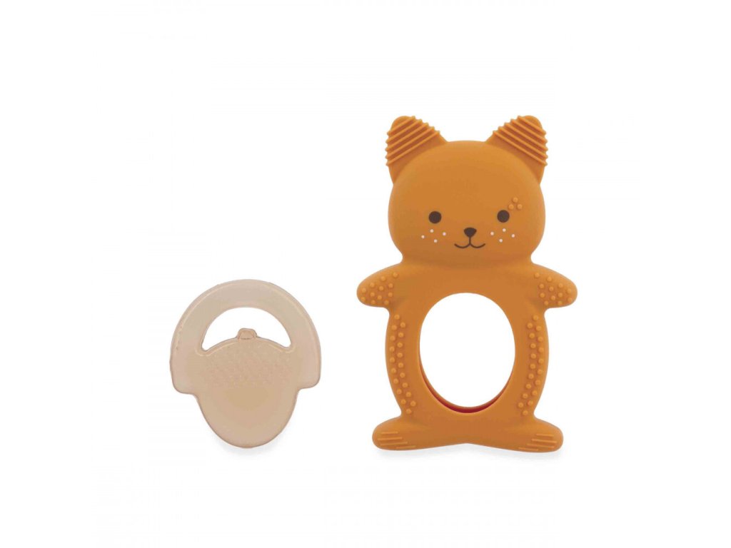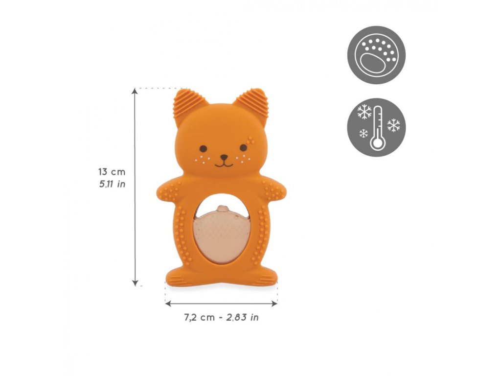 Duo pozostáva z mäkkého silikónového krúžku v tvare veveričky a chladiacej časti v tvare lieskového orieška. Chladiaci element naplnený vodou poskytuje cielené upokojenie citlivých ďasien po jeho vychladení v chladničke po dobu 10 až 20 minút. Telo veveričky je pokryté drobnými výstupkami a drážkami, ktoré jemne masírujú ďasná a stimulujú hmatové vnímanie dieťaťa. Vďaka ergonomickému tvaru a ľahkému materiálu je hračka ideálna pre malé detské ruky, čo napomáha k rozvoju jemnej motoriky.