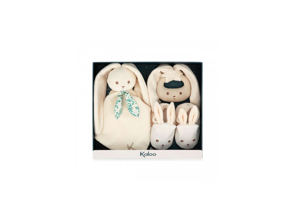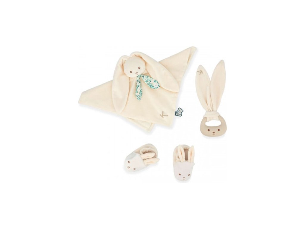 Kaloo Lapinoo Darčeková sada pre bábätko s hrkálkou hryzátkom a capačkami krémová