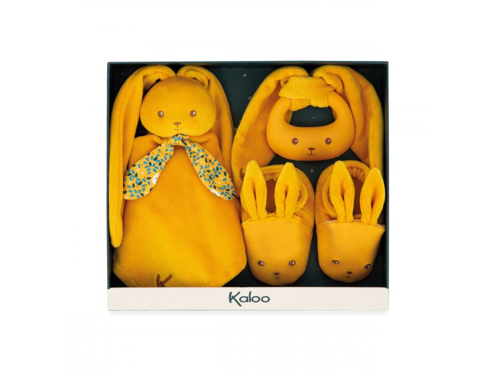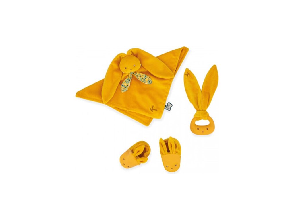 Kaloo Lapinoo Darčeková sada pre bábätko s hrkálkou hryzátkom a capačkami okrová
