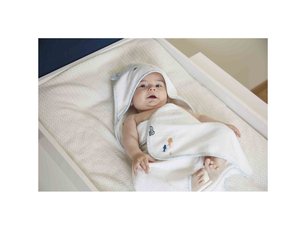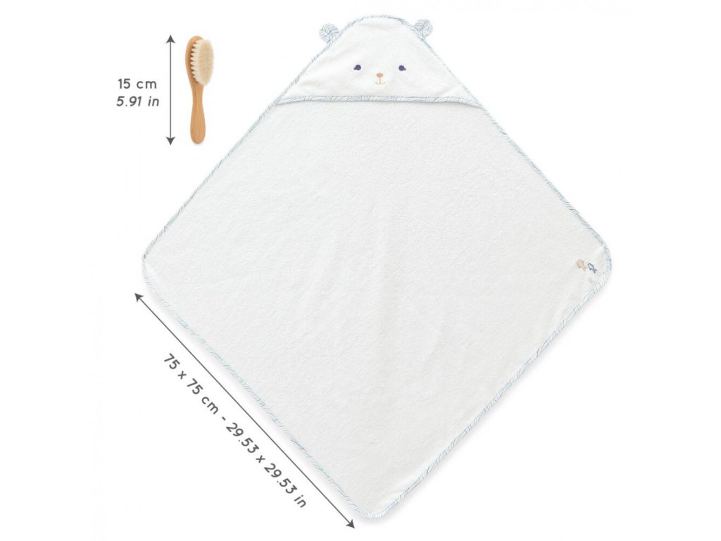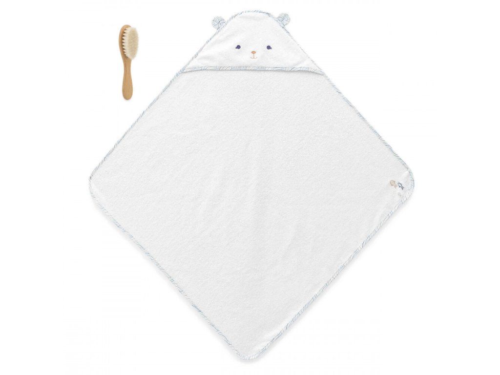 Sada je súčasťou kolekcie Petit Calme, ktorá sa zameriava na pohodlie a pohodu najmenších. Obsahuje veľkú osušku s kapucňou (75 cm) zdobenú roztomilou tvárou medvedíka. Detaily v podobe vyšitých rybičiek a vlnitých lemov evokujú pokoj morskej hladiny a nabádajú k odpočinku. Druhou časťou setu je jemná kefa na vlasy s rukoväťou z bukového dreva (s certifikáciou FSC) a ultra mäkkými štetinami z kozej srsti. Tie sú mimoriadne šetrné k citlivej detskej pokožke hlavy a jemným vláskom, čo z česania robí relaxačnú masáž.
