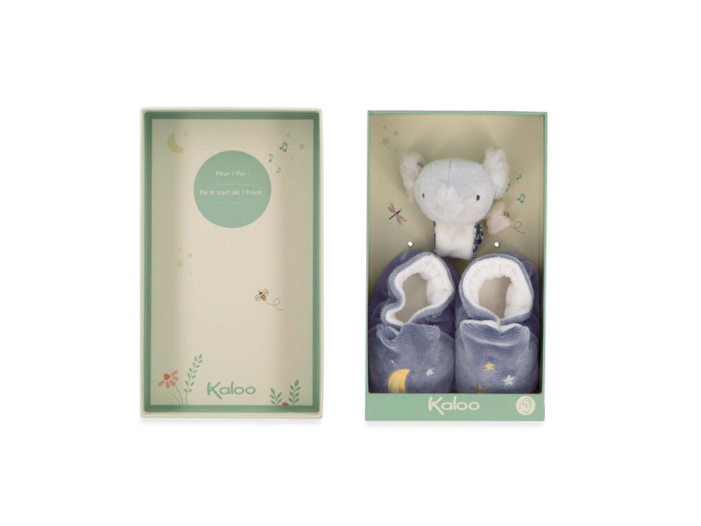 Táto sada papučiek a náramku so zajačikom je súčasťou série Petites Chansons od Kaloo: rad venovaný prebúdzaniu sa na zvuky, vyvinutý v spolupráci s tímom psychomotorických terapeutov a zložený z rôznych zvukov na stimuláciu dieťaťa.