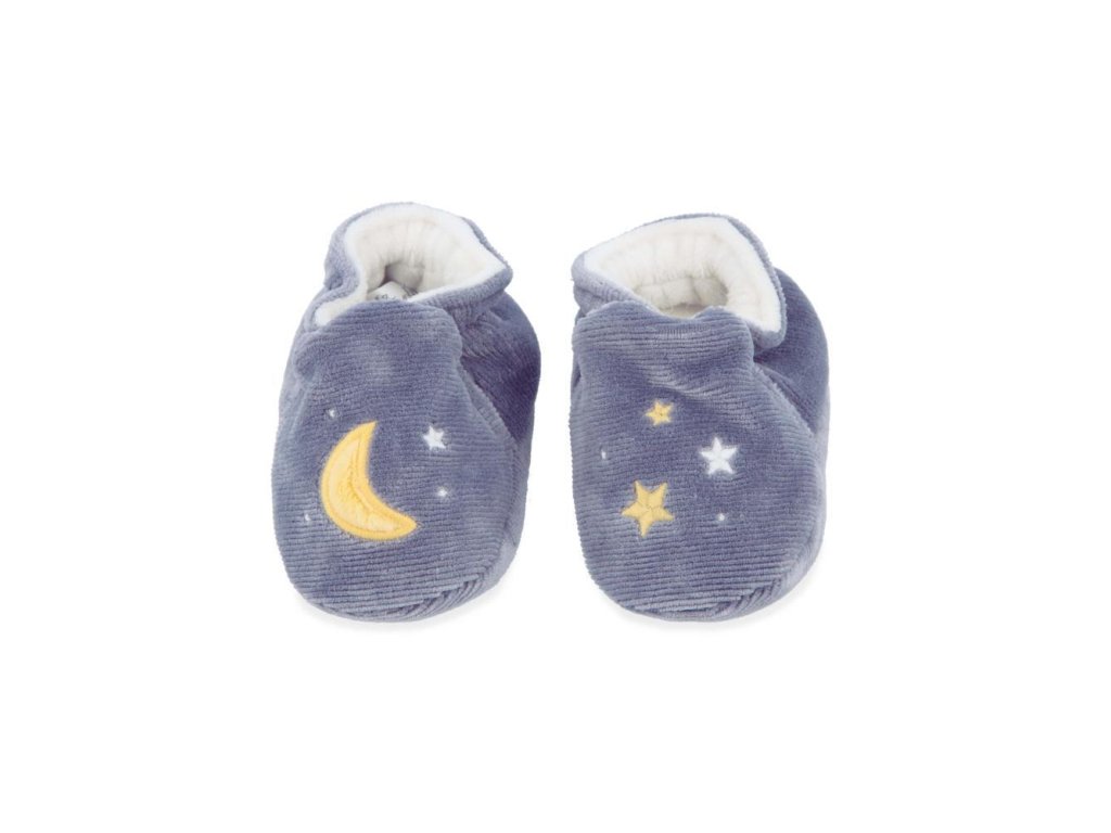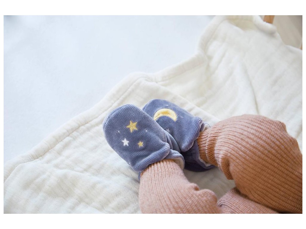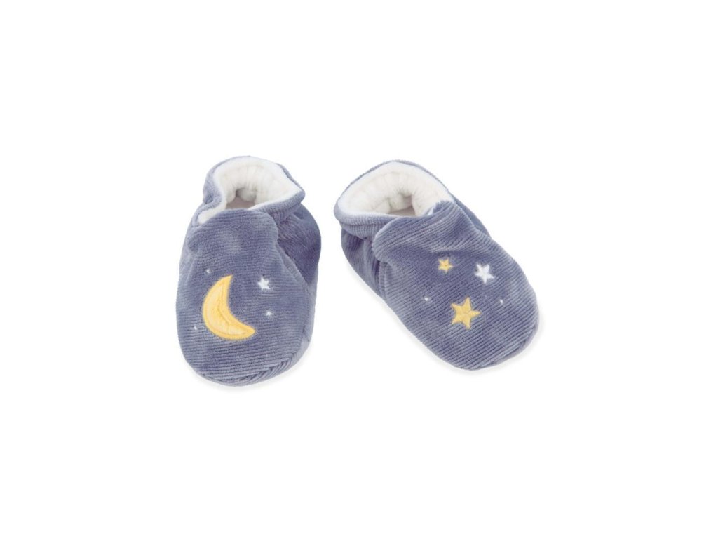 Vhodné na jemnú stimuláciu sluchu bábätka, a to už od narodenia, mikrozamatový náramok (veľkosť 3-9 mesiacov) s rozkošnou plyšovou zajačou tváričkou a zvončekom a mančestrové papučky zdobené výšivkou (12x4 cm).