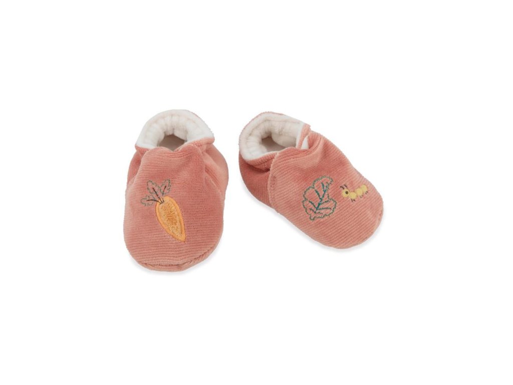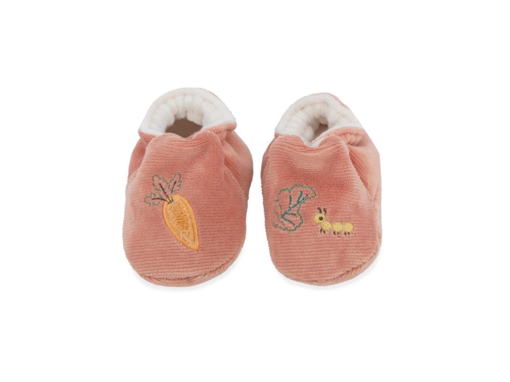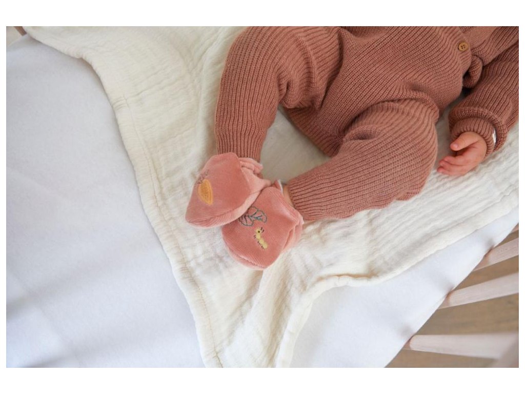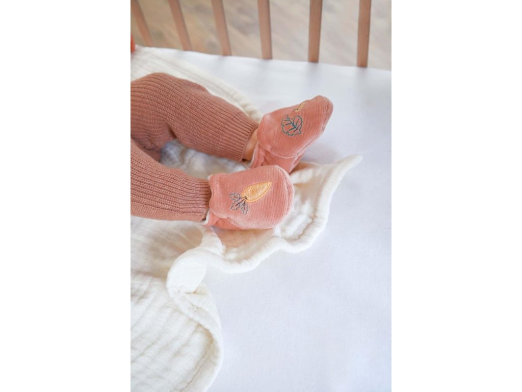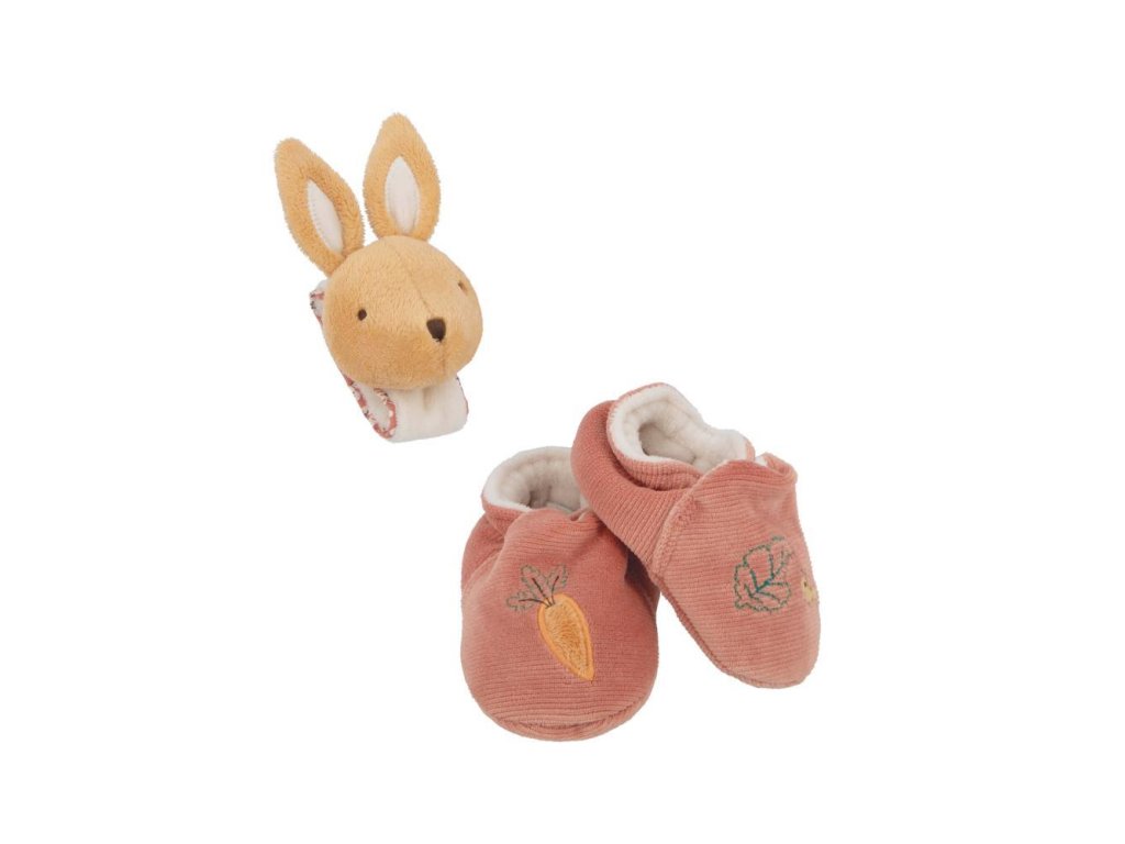 Vhodné na jemnú stimuláciu sluchu bábätka, a to už od narodenia, mikrozamatový náramok (veľkosť 3-9 mesiacov) s rozkošnou plyšovou zajačou tváričkou a zvončekom a mančestrové papučky zdobené výšivkou (12x4 cm).